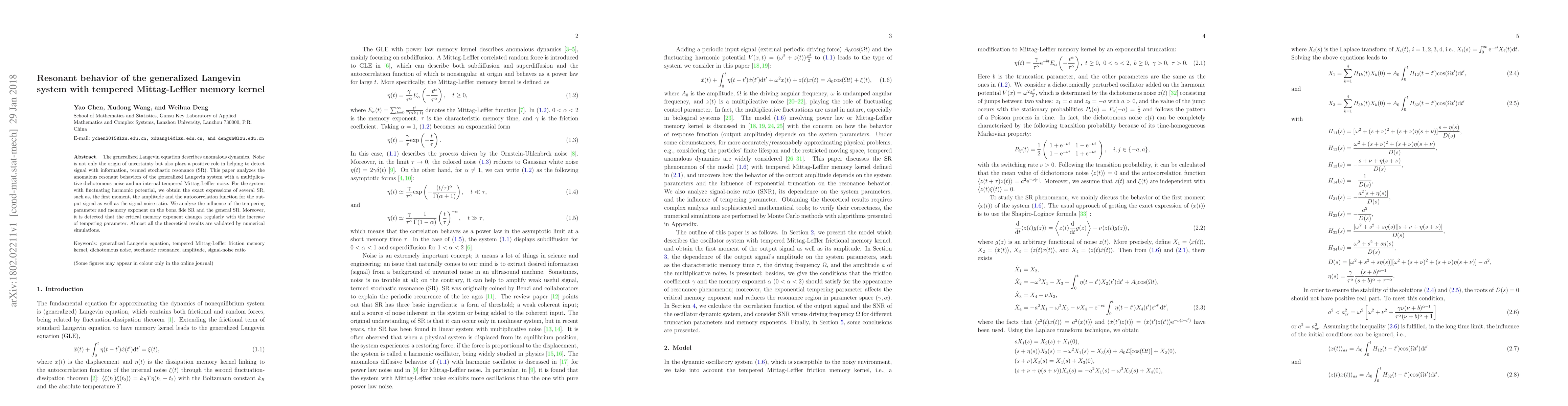 The generalized Langevin equation describes anomalous dynamics. Noise is not only the origin of uncertainty but also plays a positive role in helping to detect signal with information, termed stochastic resonance (SR). This paper analyzes the anomalous resonant behaviors of the generalized Langevin system with a multiplicative dichotomous noise and an internal tempered Mittag-Leffler noise. For the system with fluctuating harmonic potential, we obtain the exact expressions of several SR, such as, the first moment, the amplitude and the autocorrelation function for the output signal as well as the signal-noise ratio. We analyze the influence of the tempering parameter and memory exponent on the bona fide SR and the general SR. Moreover, it is detected that the critical memory exponent changes regularly with the increase of tempering parameter. Almost all the theoretical results are validated by numerical simulations.