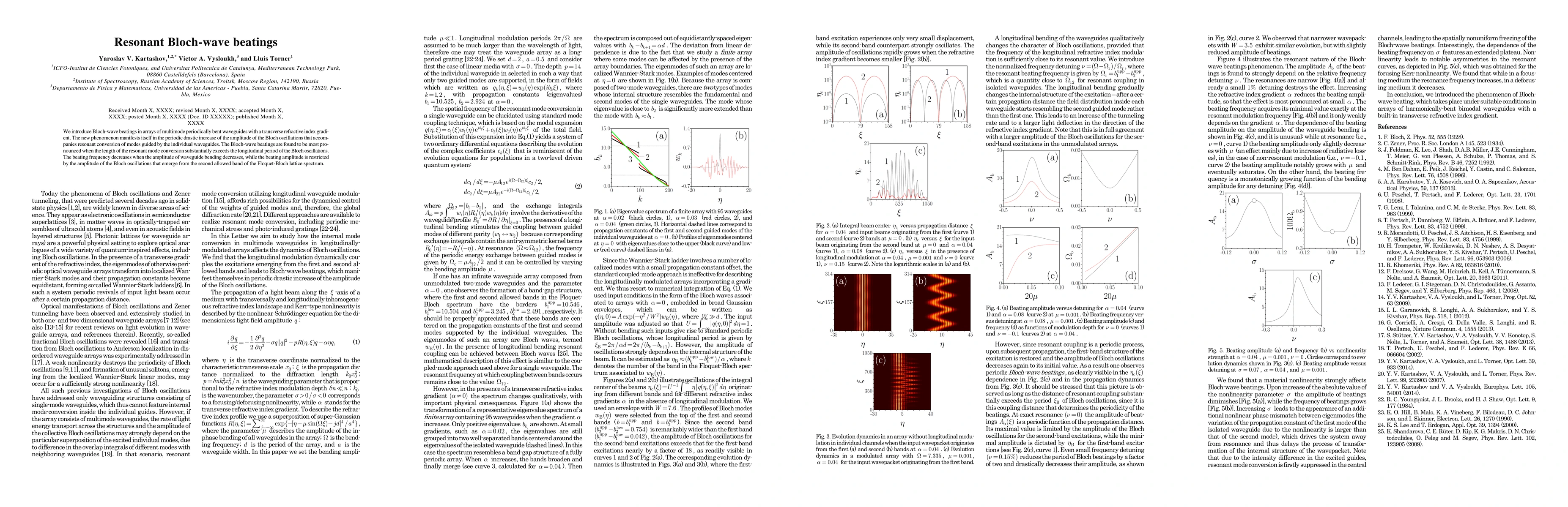 We introduce Bloch-wave beatings in arrays of multimode periodically bent waveguides with a transverse refractive index gradient. The new phenomenon manifests itself in the periodic drastic increase of the amplitude of the Bloch oscillations that accompanies resonant conversion of modes guided by the individual waveguides. The Bloch-wave beatings are found to be most pronounced when the length of the resonant mode conversion substantially exceeds the longitudinal period of the Bloch oscillations. The beating frequency decreases when the amplitude of waveguide bending decreases, while the beating amplitude is restricted by the amplitude of the Bloch oscillations that emerge from the second allowed band of the Floquet-Bloch lattice spectrum.