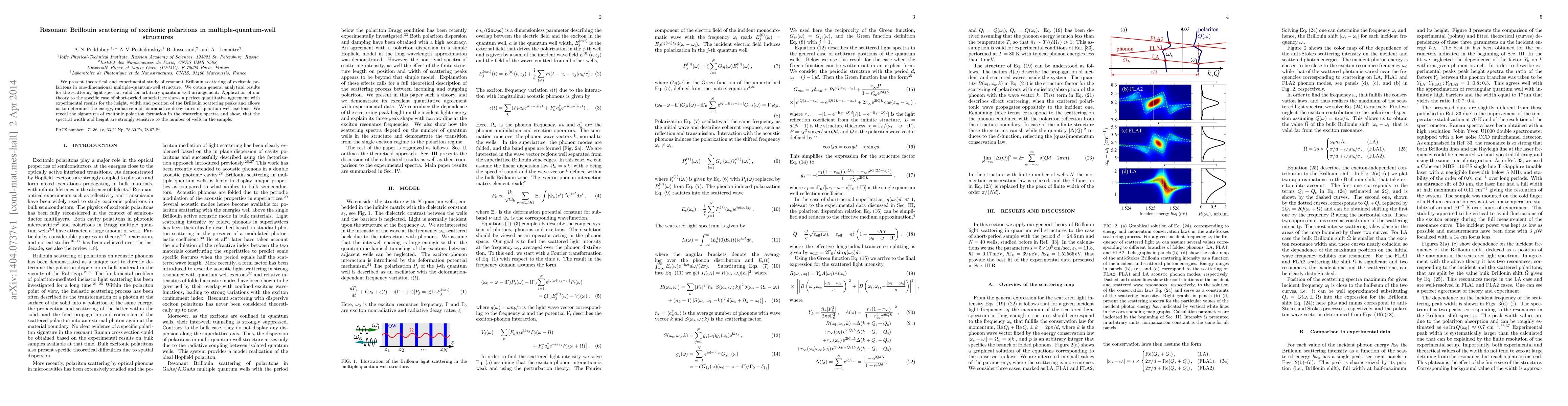 This paper presents a theoretical and experimental study of resonant Brillouin scattering in multiple-quantum-well structures, deriving analytical results for scattering spectra. The theory accurately matches experimental data, revealing excitonic polariton formation and showing sensitivity of spectral width and height to the number of wells.