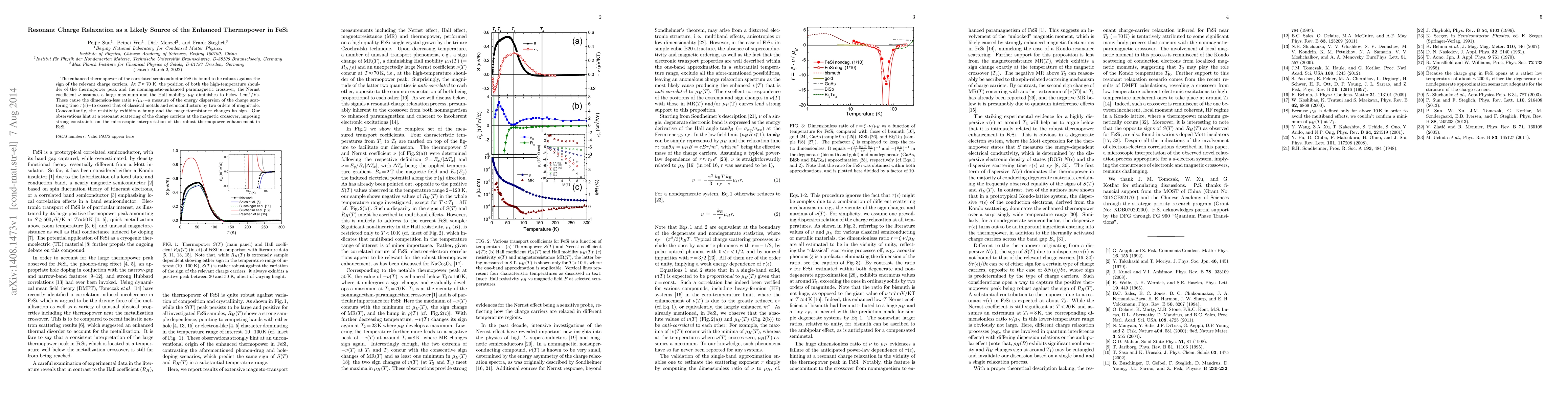 The enhanced thermopower in FeSi is robust against the type of charge carriers, with significant changes in the Nernst coefficient and Hall mobility at around 70 K, suggesting resonant charge relaxation as a key factor. This phenomenon leads to a much higher dimensionless ratio of thermopower to Hall mobility compared to classical metals and semiconductors, indicating strong constraints on the microscopic mechanisms behind the thermopower enhancement.