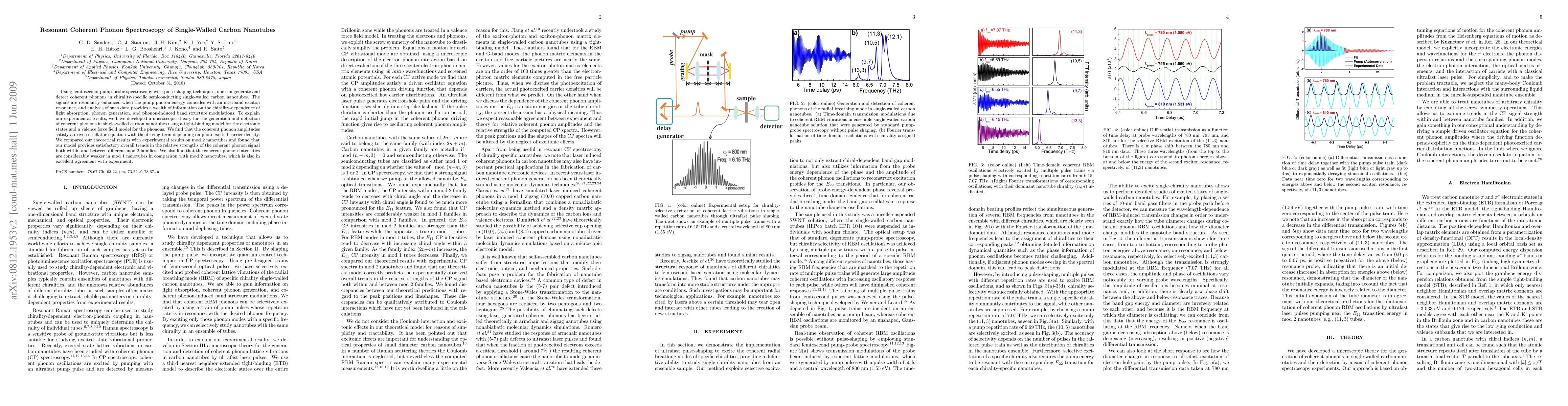 This paper employs femtosecond spectroscopy to generate and detect coherent phonons in semiconducting single-walled carbon nanotubes, revealing chirality-specific resonant enhancements. A tight-binding model and valence force field theory are used to explain experimental observations, showing coherent phonon behavior dependent on photoexcited carrier density and confirming significant differences in phonon amplitudes between mod 2 and mod 1 nanotubes.