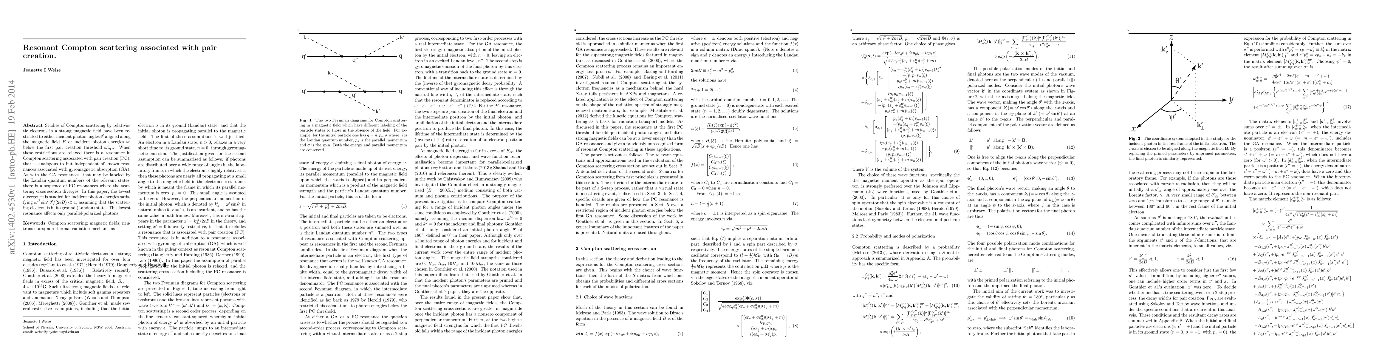 Studies of Compton scattering by relativistic electrons in a strong magnetic field have been restricted to either incident photon angles $\theta'$ aligned along the magnetic field $B$ or incident photon energies $\omega'$ below the first pair creation threshold $\omega'_{PC}$. When these restrictions are relaxed there is a resonance in Compton scattering associated with pair creation (PC), that is analogous to but independent of known resonances associated with gyromagnetic absorption (GA). As with the GA resonances, that may be labeled by the Landau quantum numbers of the relevant states, there is a sequence of PC resonances where the scattering cross section diverges. In this paper, the lowest divergence is studied for incident photon energies satisfying ${\omega'}^2\sin^2\theta'/(2eB)\ll1$, assuming that the scattering electron is in its ground (Landau) state. This lowest resonance affects only parallel-polarized photons.