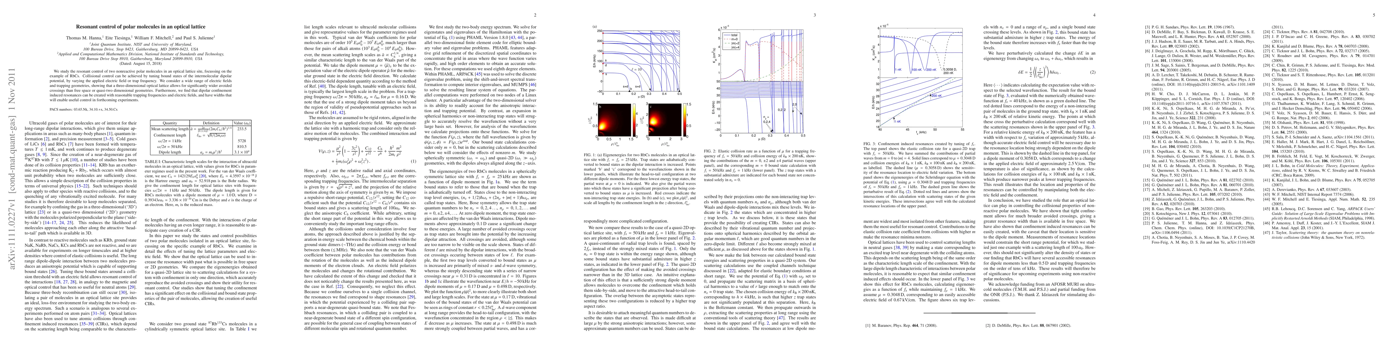 We study the resonant control of two nonreactive polar molecules in an optical lattice site, focussing on the example of RbCs. Collisional control can be achieved by tuning bound states of the intermolecular dipolar potential, by varying the applied electric field or trap frequency. We consider a wide range of electric fields and trapping geometries, showing that a three-dimensional optical lattice allows for significantly wider avoided crossings than free space or quasi-two dimensional geometries. Furthermore, we find that dipolar confinement induced resonances can be created with reasonable trapping frequencies and electric fields, and have widths that will enable useful control in forthcoming experiments.