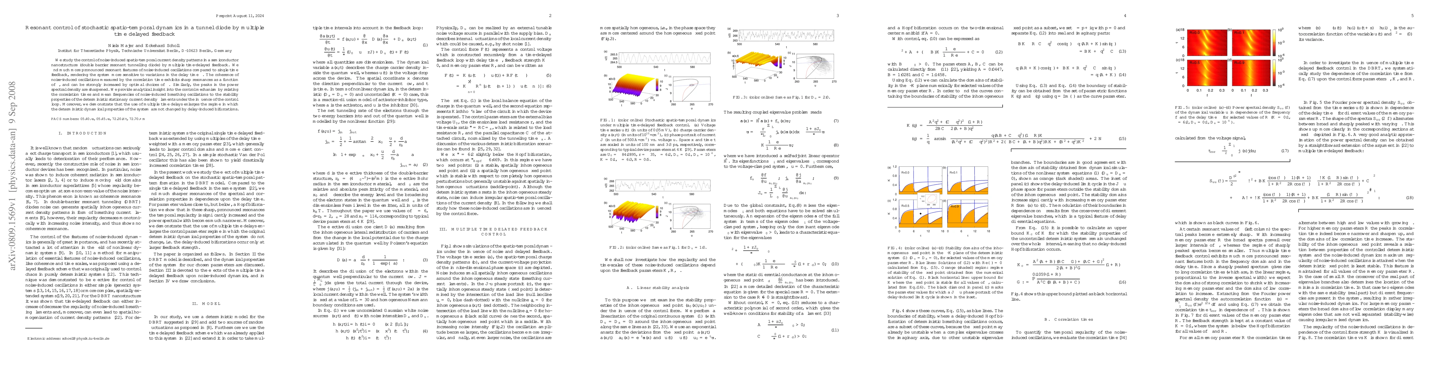 This paper explores the control of noise-induced patterns in a double barrier resonant tunnelling diode using multiple time-delayed feedback, revealing enhanced resonant features and increased sensitivity to delay times. The study shows that optimal delay times can significantly sharpen coherence and power spectral density, providing analytical insights into the underlying control mechanisms.