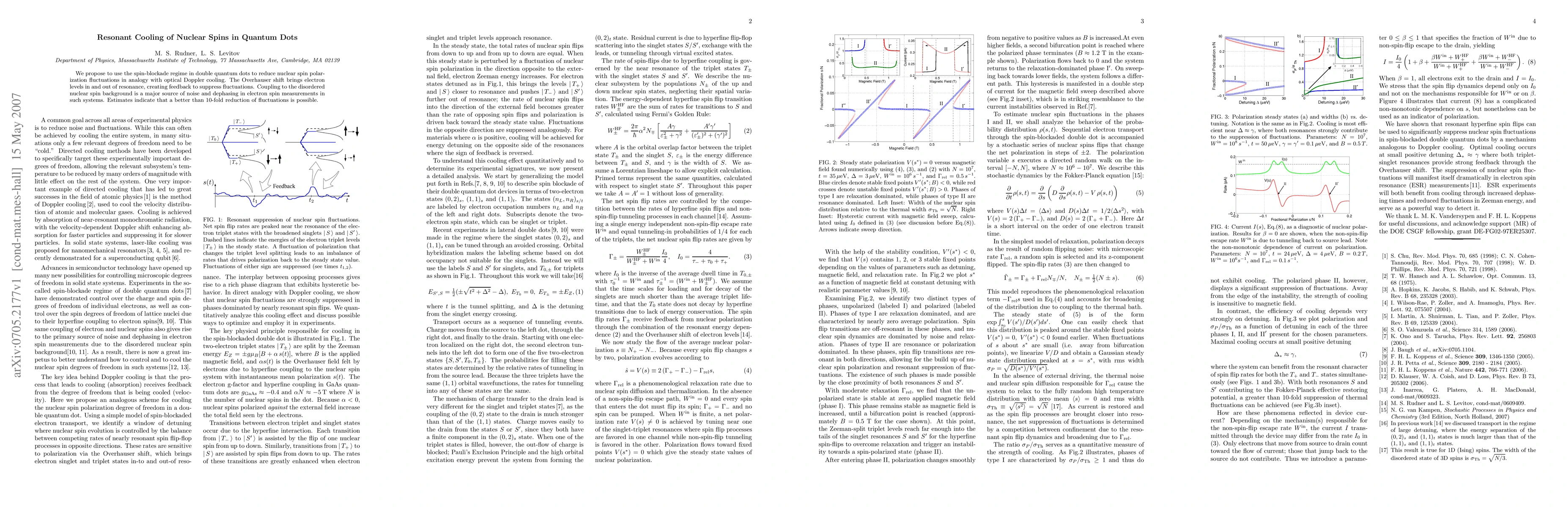 This paper proposes using the spin-blockade regime in double quantum dots to achieve resonant cooling of nuclear spins, aiming to reduce nuclear spin polarization fluctuations and improve electron spin measurement precision by over 10-fold. The Overhauser shift is utilized to create feedback that suppresses fluctuations, addressing noise from disordered nuclear spin coupling.