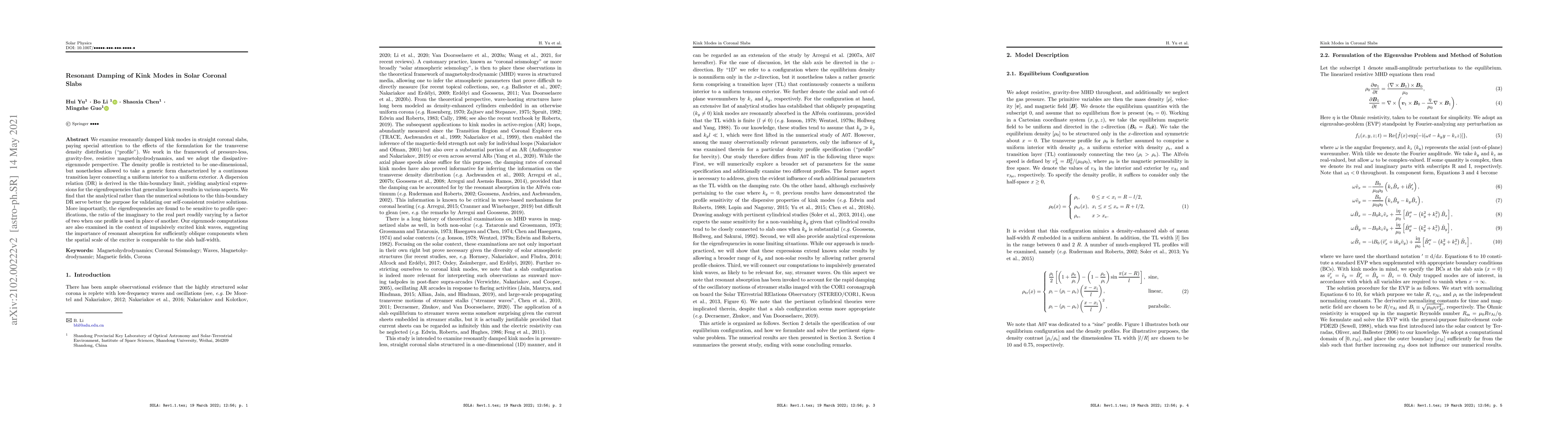 This paper investigates resonant damping of kink modes in solar coronal slabs, focusing on the impact of different transverse density profiles. The study employs analytical solutions to derive a dispersion relation in the thin-boundary limit, revealing that eigenfrequencies are highly sensitive to the density profile specification, with significant implications for resonant absorption of kink waves.