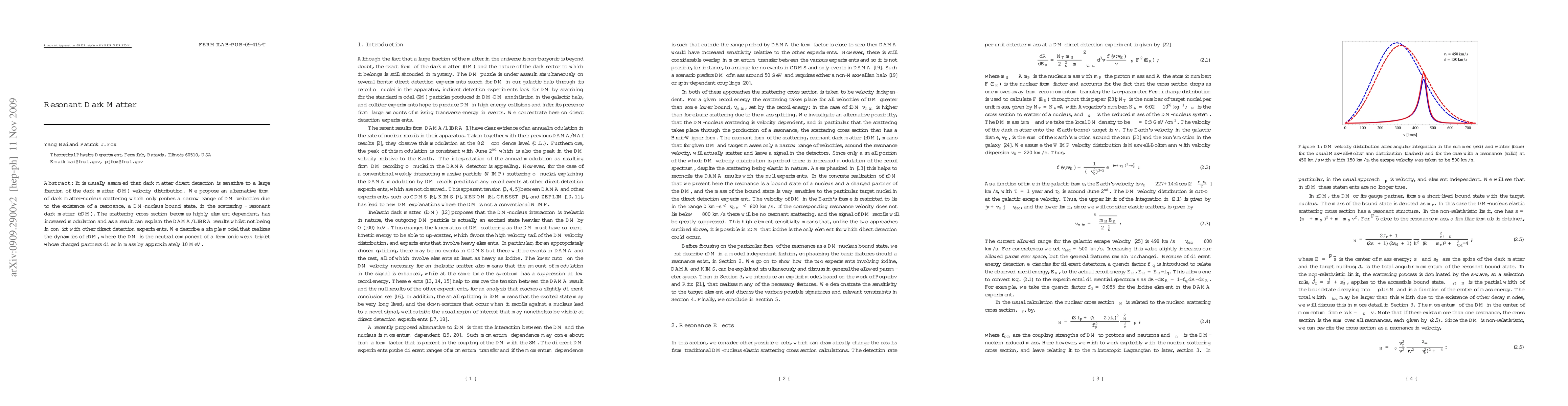 This paper proposes a novel form of dark matter called resonant dark matter (rDM) that interacts via a resonance, leading to a highly element-dependent scattering cross section. This model can explain the DAMA/LIBRA results while remaining consistent with other direct detection experiments.