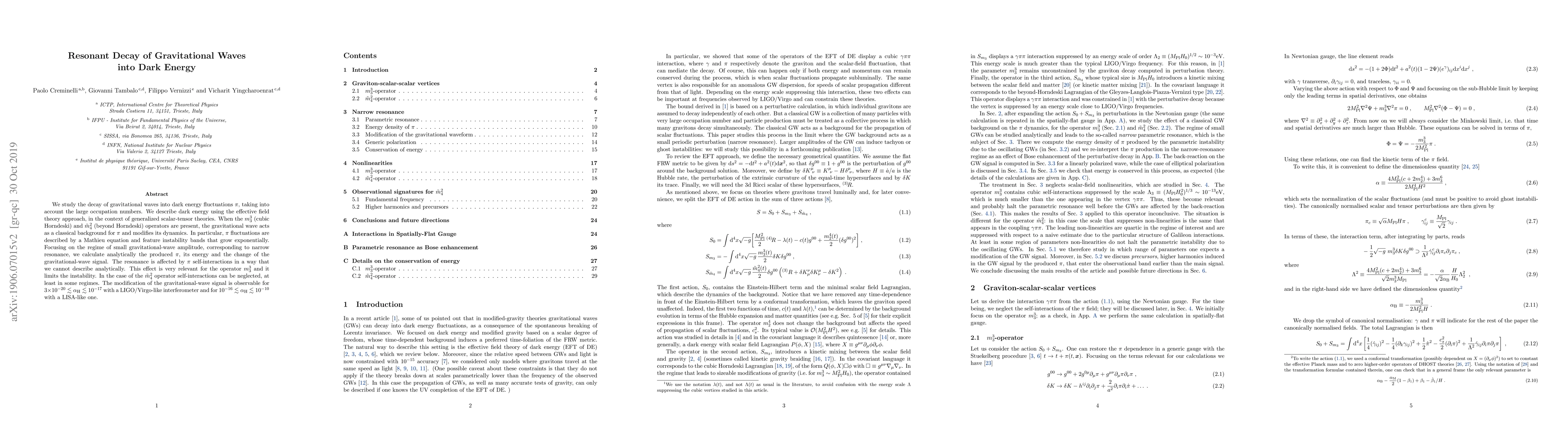 We study the decay of gravitational waves into dark energy fluctuations $\pi$, taking into account the large occupation numbers. We describe dark energy using the effective field theory approach, in the context of generalized scalar-tensor theories. When the $m_3^3$ (cubic Horndeski) and $\tilde m_4^2$ (beyond Horndeski) operators are present, the gravitational wave acts as a classical background for $\pi$ and modifies its dynamics. In particular, $\pi$ fluctuations are described by a Mathieu equation and feature instability bands that grow exponentially. Focusing on the regime of small gravitational-wave amplitude, corresponding to narrow resonance, we calculate analytically the produced $\pi$, its energy and the change of the gravitational-wave signal. The resonance is affected by $\pi$ self-interactions in a way that we cannot describe analytically. This effect is very relevant for the operator $m_3^3$ and it limits the instability. In the case of the $\tilde m_4^2$ operator self-interactions can be neglected, at least in some regimes. The modification of the gravitational-wave signal is observable for $3 \times 10^{-20} \lesssim \alpha_{\rm H} \lesssim 10^{-17}$ with a LIGO/Virgo-like interferometer and for $10^{-16} \lesssim \alpha_{\rm H} \lesssim 10^{-10}$ with a LISA-like one.