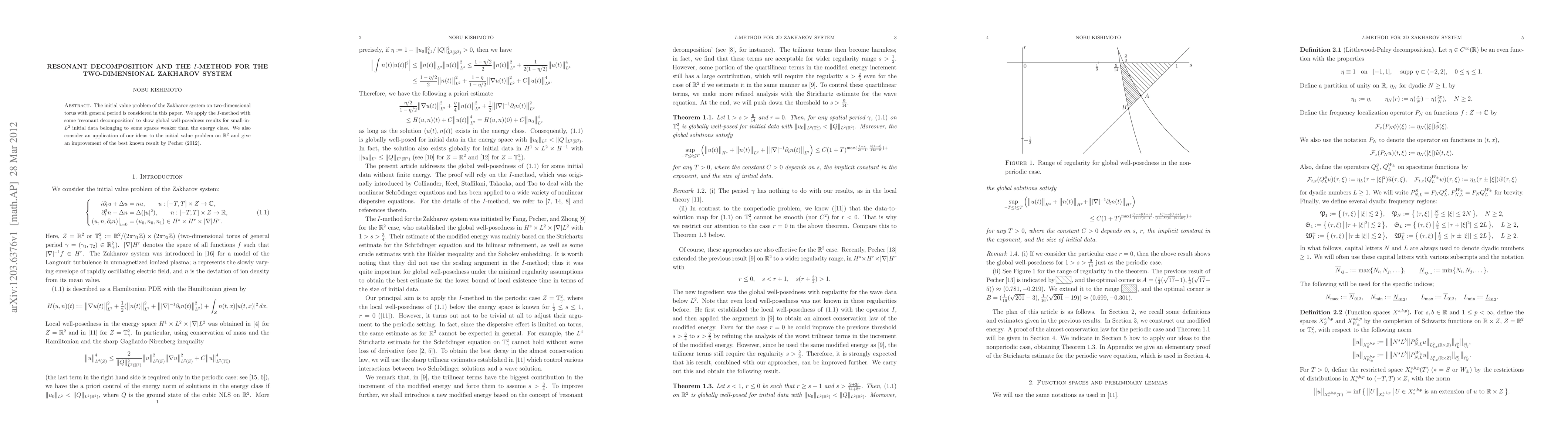 The initial value problem of the Zakharov system on two-dimensional torus with general period is considered in this paper. We apply the $I$-method with some 'resonant decomposition' to show global well-posedness results for small-in-$L^2$ initial data belonging to some spaces weaker than the energy class. We also consider an application of our ideas to the initial value problem on $\mathbb{R}^2$ and give an improvement of the best known result by Pecher (2012).