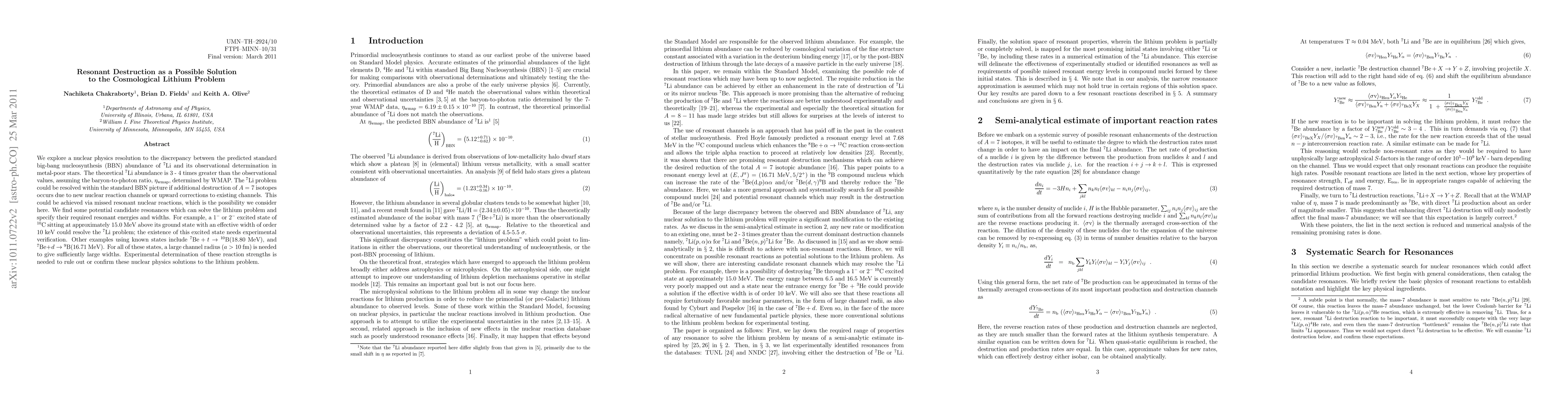 This paper investigates nuclear physics solutions to the cosmological lithium problem, where the predicted 7Li abundance from big-bang nucleosynthesis exceeds observations by a factor of 3-4. It proposes that additional resonant nuclear reactions could destroy 7Li, suggesting potential candidates like a 10C excited state at 15.0 MeV and reactions involving 7Be+t and 7Be+d, requiring experimental verification to confirm these solutions.