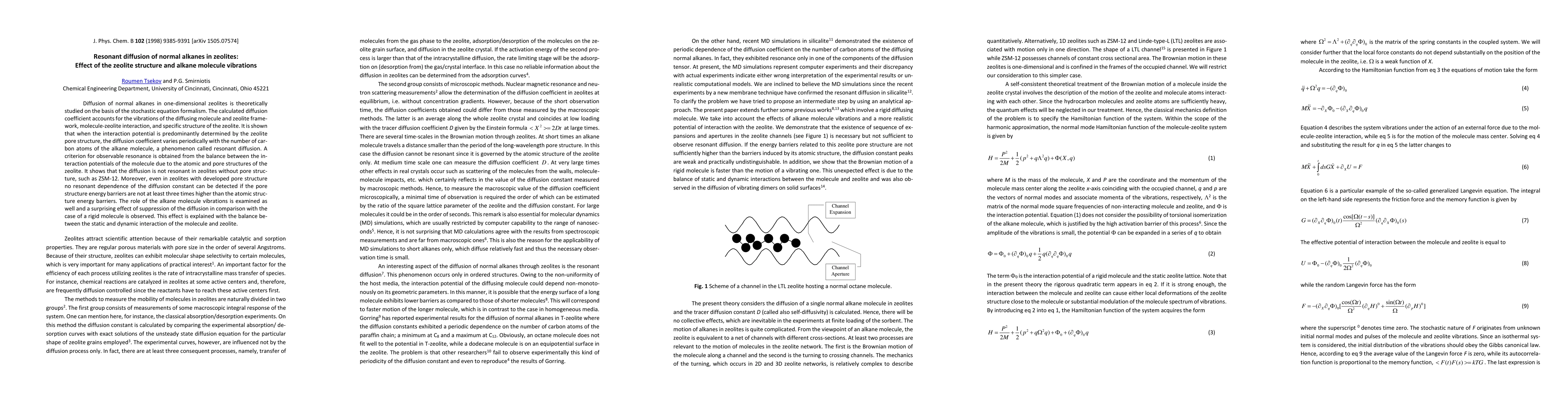 The study explores how normal alkanes diffuse in one-dimensional zeolites, revealing a phenomenon called resonant diffusion that varies with the number of carbon atoms in the alkane molecule. The researchers found that this effect is influenced by the zeolite's structure and pore energy barriers, but not always present even in zeolites with developed pores.
