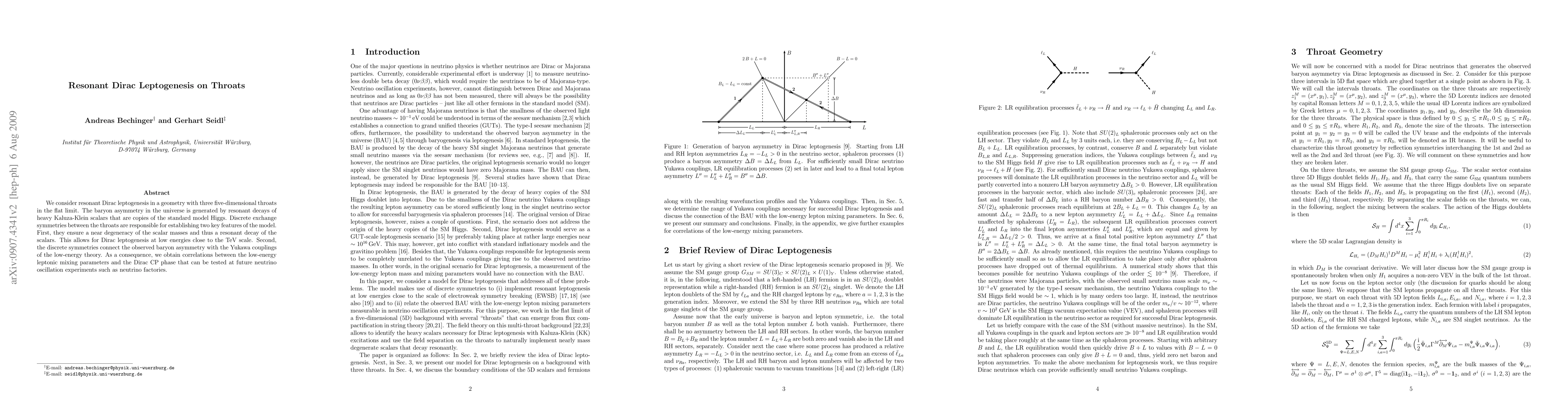 We consider resonant Dirac leptogenesis in a geometry with three five-dimensional throats in the flat limit. The baryon asymmetry in the universe is generated by resonant decays of heavy Kaluza-Klein scalars that are copies of the standard model Higgs. Discrete exchange symmetries between the throats are responsible for establishing two key features of the model. First, they ensure a near degeneracy of the scalar masses and thus a resonant decay of the scalars. This allows for Dirac leptogenesis at low energies close to the TeV scale. Second, the discrete symmetries connect the observed baryon asymmetry with the Yukawa couplings of the low-energy theory. As a consequence, we obtain correlations between the low-energy leptonic mixing parameters and the Dirac CP phase that can be tested at future neutrino oscillation experiments such as neutrino factories.