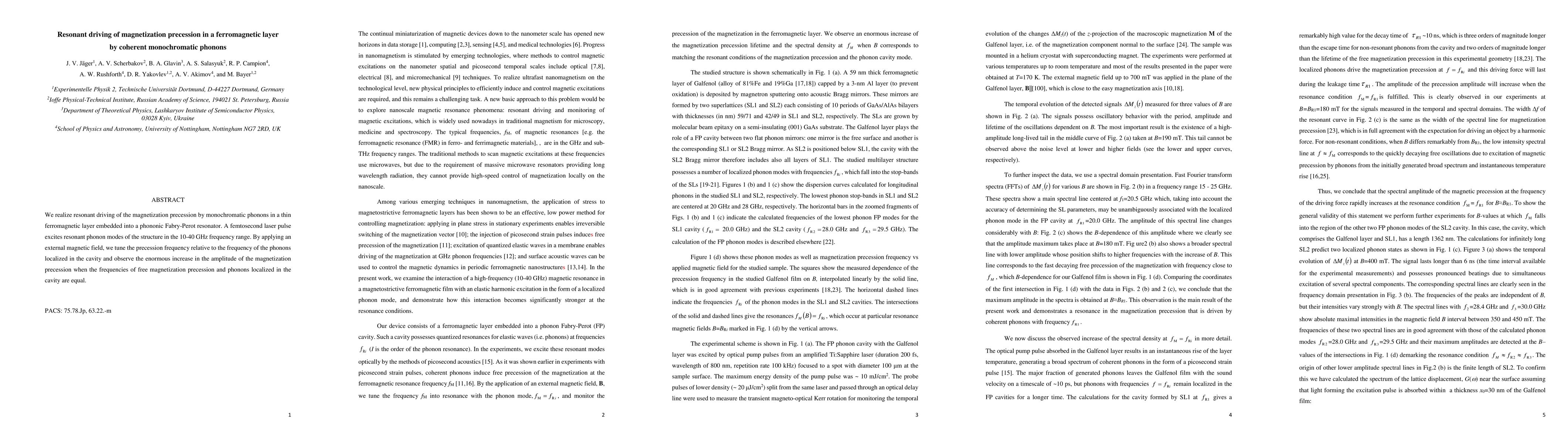 This paper demonstrates resonant driving of magnetization precession in a ferromagnetic layer using coherent monochromatic phonons within a phononic Fabry-Perot resonator. The study shows a significant increase in precession amplitude when the phonon frequency matches the precession frequency, achieved by tuning with an external magnetic field.