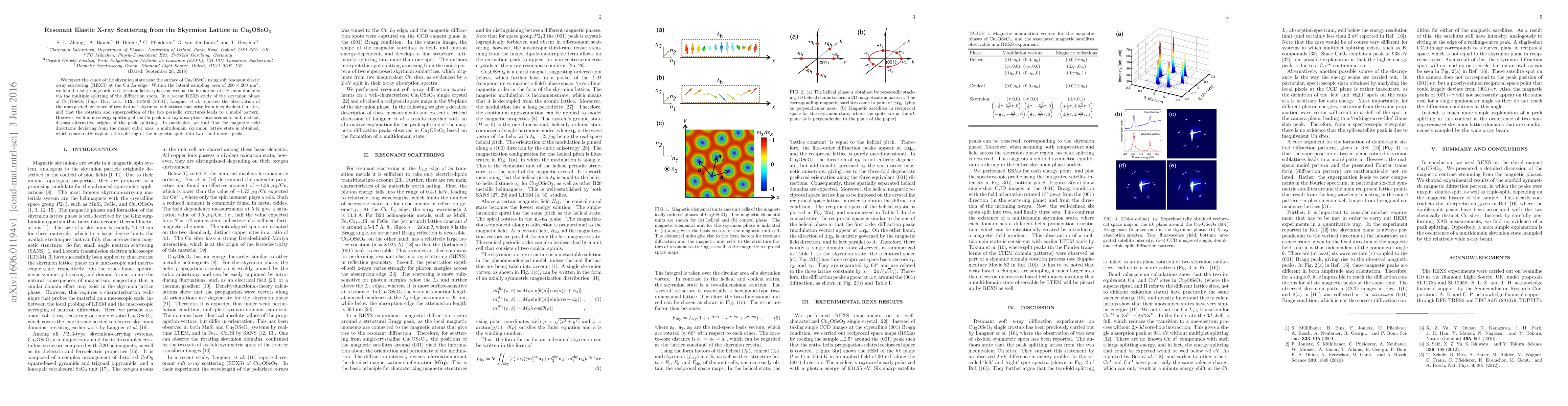 This study uses resonant elastic x-ray scattering to investigate the skyrmion lattice in Cu₂OSeO₃, revealing a long-range-ordered skyrmion lattice and domain formation. Contrary to previous findings, the study finds no energy splitting in Cu peaks, suggesting alternative explanations for the observed splitting of diffraction spots, particularly in multidomain states under non-aligned magnetic fields.