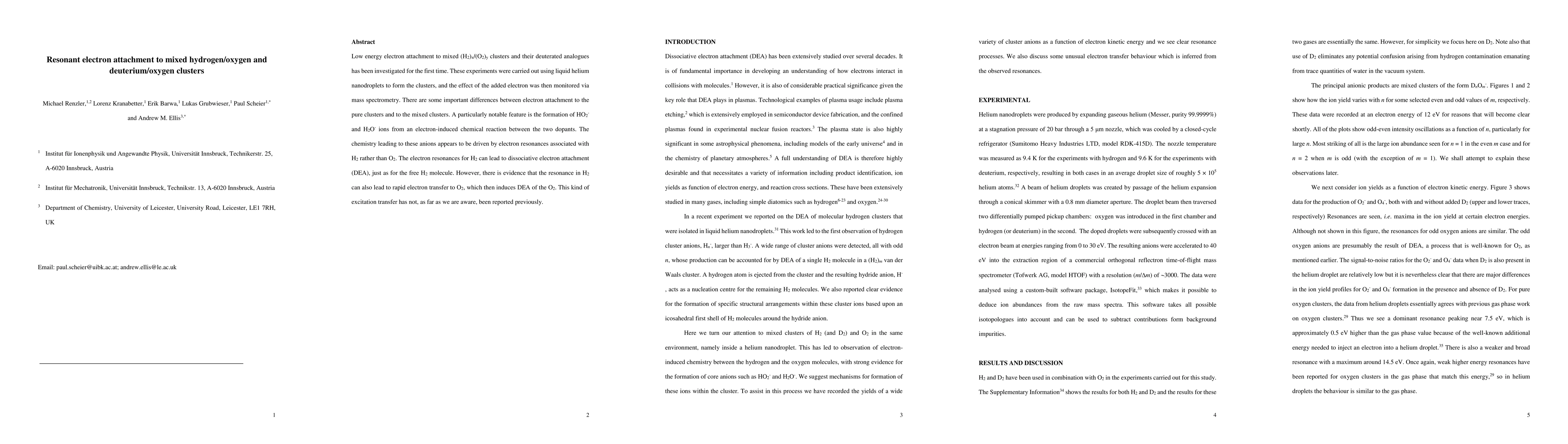 This study investigates for the first time, low energy electron attachment to mixed hydrogen/oxygen and deuterium/oxygen clusters using liquid helium nanodroplets. Key findings include the formation of HO$_2$$^{-}$ and H$_2$O$^{-}$ ions from electron-induced reactions between dopants, with electron resonances in H$_2$ driving this chemistry, potentially facilitating excitation transfer to O$_2$ for dissociative electron attachment.