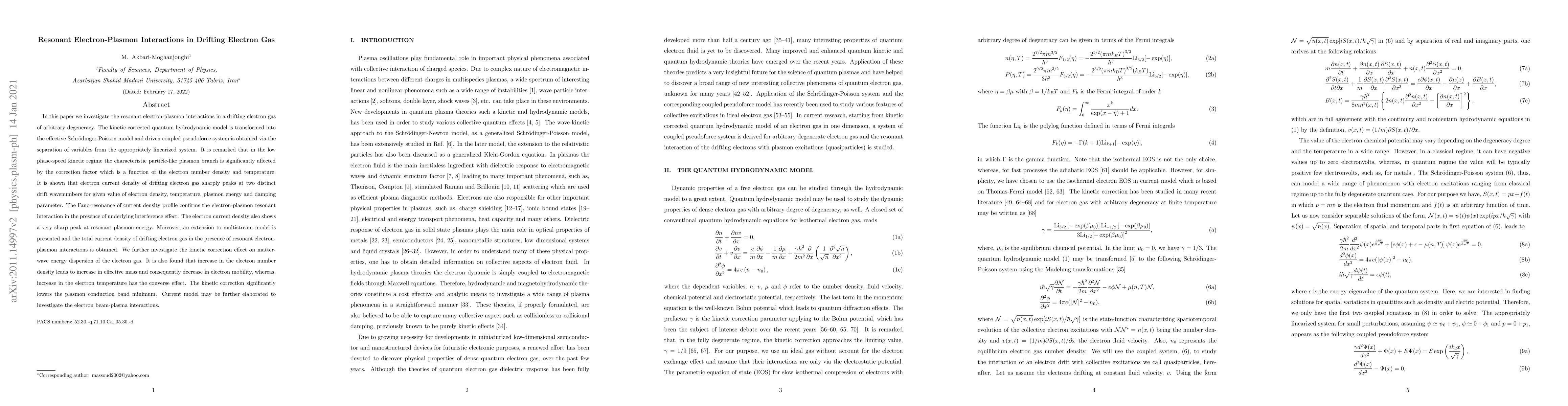 In this paper we investigate the resonant electron-plasmon interactions in a drifting electron gas of arbitrary degeneracy. The kinetic corrected quantum hydrodyanmic model is transformed into the effective Schr\"{o}dinger-Poisson model and driven coupled pseudoforce system is obtained via the separation of variables from the appropriately linearized system. It is remarked that in the low phase-speed kinetic regime the characteristic particle-like plasmon branch is profoundly affected by this correction which is a function of the electron number density and temperature. We also present an alternative explanation of the quantum wave-particle duality as a direct consequence of resonant electron-plasmon interaction (electron murmuration). In this picture drifting electrons are resonantly scattered by spatial electrostatic energy distribution, characterizing them by the de Broglie's oscillations. The phase-shift and amplitude of excitations in damped driven pseudoforce system is derived and their variations in terms of normalized chemical potential and electron temperature is studied. In particular we investigate the kinetic correction effect on energy dispersion relation in the electron gas in detail. It is revealed that only the low phase-speed branch of the dispersion curve is significantly affected by the kinetic correction. It is also found that increase in the electron number density leads to increase in effective mass and consequently decrease in electron mobility while the increase in the electron temperature has the converse effect. The kinetic correction also significantly lowers the plasmon conduction band. Current model may be further elaborated to investigate the beam-plasmon interaction and energy exchange in multispecies quantum plasmas.