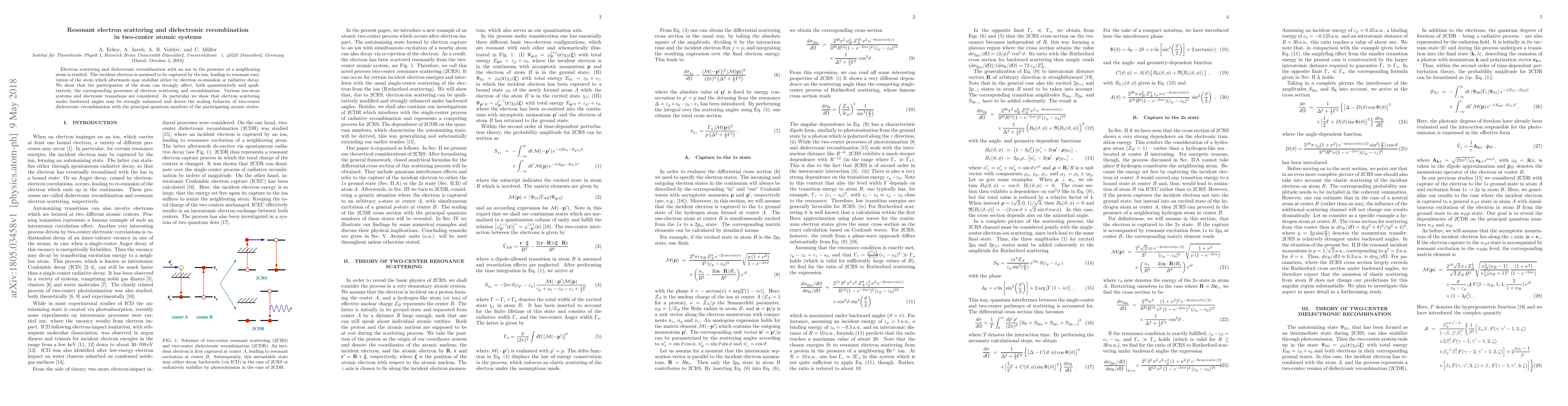 This paper investigates electron scattering and dielectronic recombination in two-center atomic systems where an ion interacts with a neighboring atom. It demonstrates that the presence of the atom can significantly alter these processes, including enhancing electron scattering under backward angles and deriving the scaling behavior of dielectronic recombination with atomic quantum states.