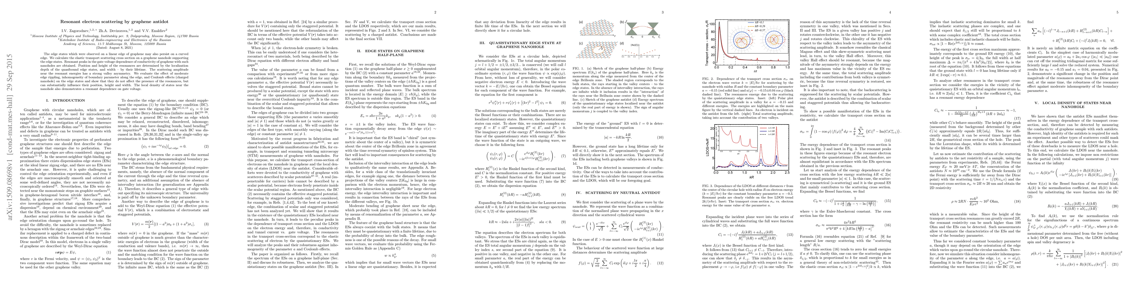 The edge states which were observed on a linear edge of graphene may also persist on a curved edge. We calculate the elastic transport scattering cross section on a graphene nanohole supporting the edge states. Resonant peaks in the gate voltage dependence of conductivity of graphene with such nanoholes are obtained. Position and height of the resonances are determined by the localization depth of the quasibound edge states, and width -- by their lifetime. The scattering amplitude near the resonant energies has a strong valley asymmetry. We evaluate the effect of moderate edge rippling, inhomogeneity of boundary parameter along the edge, and Coulomb effects (charged nanohole) on the edge states and show that they do not affect the presence of the resonances, but can substantially influence their position, height and width. The local density of states near the nanohole also demonstrates a resonant dependence on gate voltage.