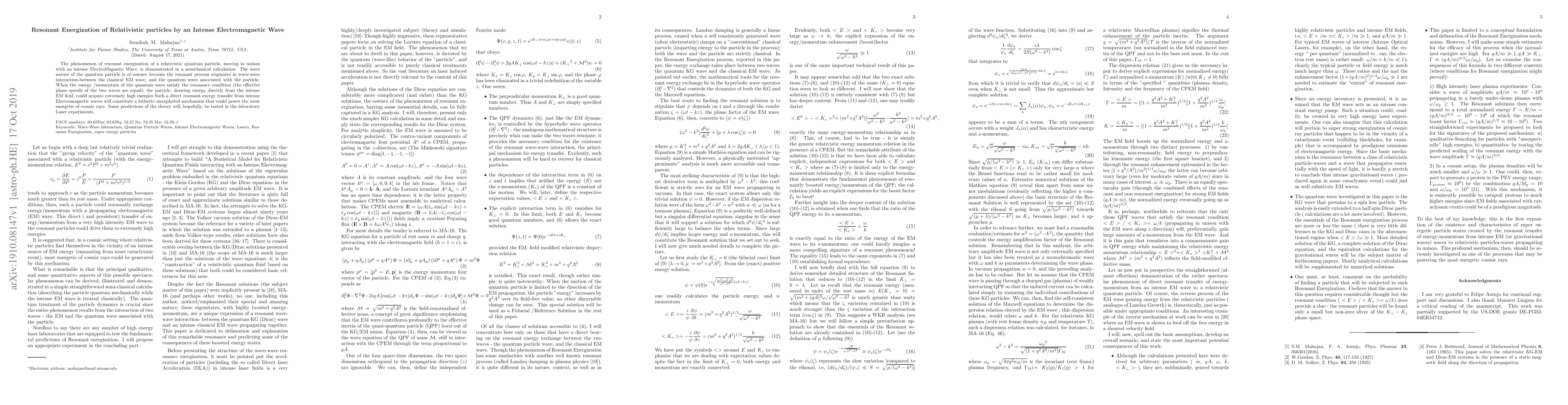 The phenomenon of resonant energization of a relativistic quantum particle, moving in unison with an intense ElectroMagnetic Wave, is demonstrated in a semiclassical calculation. The wave nature of the quantum particle is of essence because the resonant process originates in wave-wave interaction-between the classical EM wave, and the quantum wave associated with the particle. When the energy /momentum of the quantum wave satisfy the resonance condition (the effective phase speeds of the two waves are equal), the particle, drawing energy directly from the intense EM field, could acquire extremely high energies Such a direct resonant energy transfer from intense Electromagnetic waves will constitute a hitherto unexploited mechanism that could power the most energetic of cosmic rays. Some predictions of the theory will, hopefully, be tested in the laboratory Laser experiments.