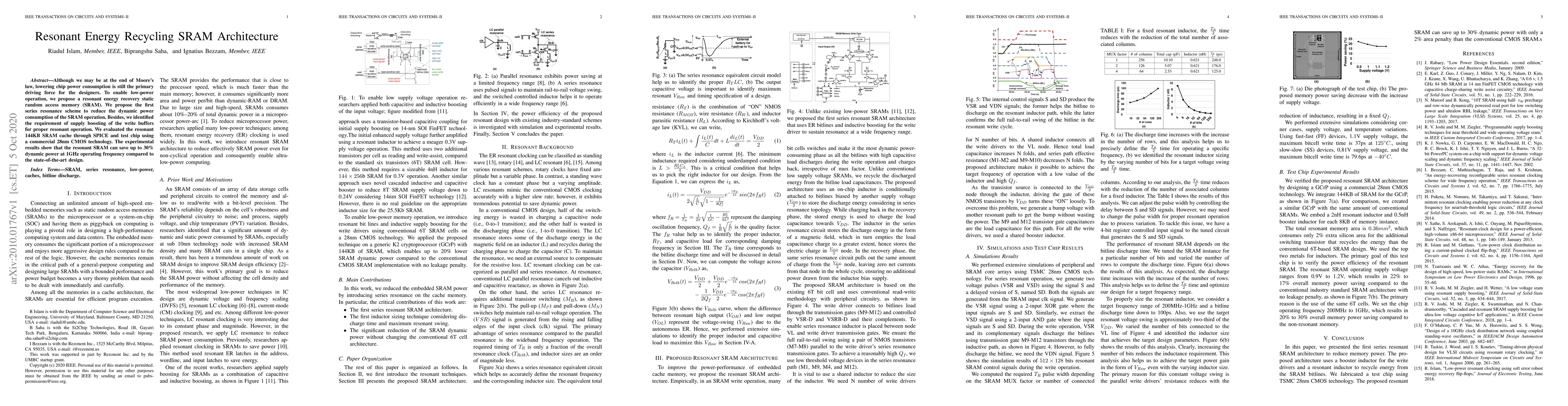 This paper proposes a resonant energy recovery SRAM architecture to reduce dynamic power consumption, leveraging a series resonance scheme. Experimental results show a 30% reduction in dynamic power compared to state-of-the-art designs at 1GHz, achieved through supply boosting of write buffers.