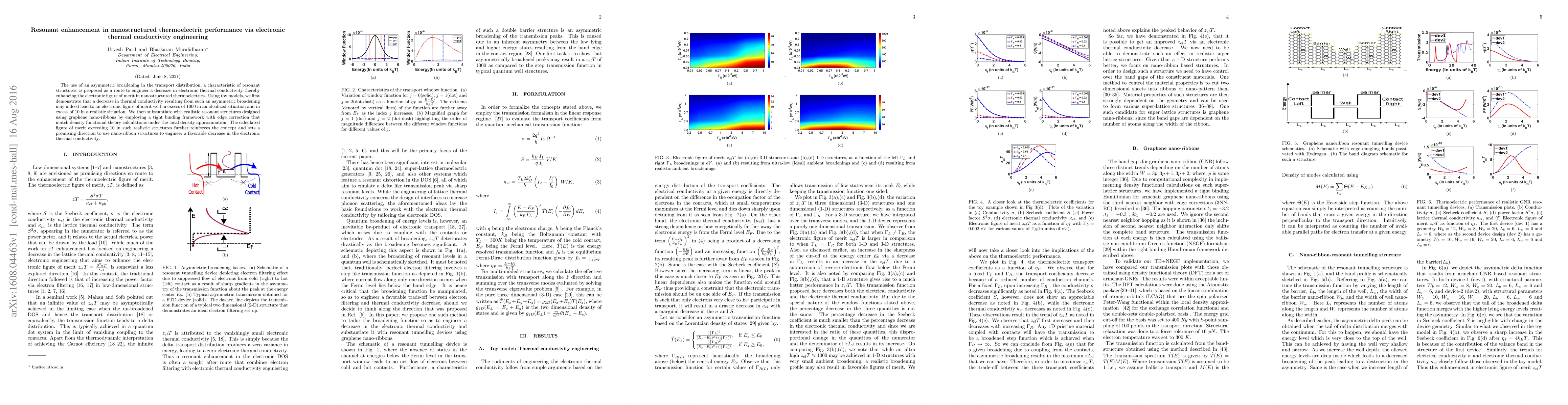 The use of an asymmetric broadening in the transport distribution, a characteristic of resonant structures, is proposed as a route to engineer a decrease in electronic thermal conductivity thereby enhancing the electronic figure of merit in nanostructured thermoelectrics. Using toy models, we first demonstrate that a decrease in thermal conductivity resulting from such an asymmetric broadening may indeed lead to an electronic figure of merit well in excess of 1000 in an idealized situation and in excess of 10 in a realistic situation. We then substantiate with realistic resonant structures designed using graphene nano-ribbons by employing a tight binding framework with edge correction that match density functional theory calculations under the local density approximation. The calculated figure of merit exceeding 10 in such realistic structures further reinforces the concept and sets a promising direction to use nano-ribbon structures to engineer a favorable decrease in the electronic thermal conductivity.