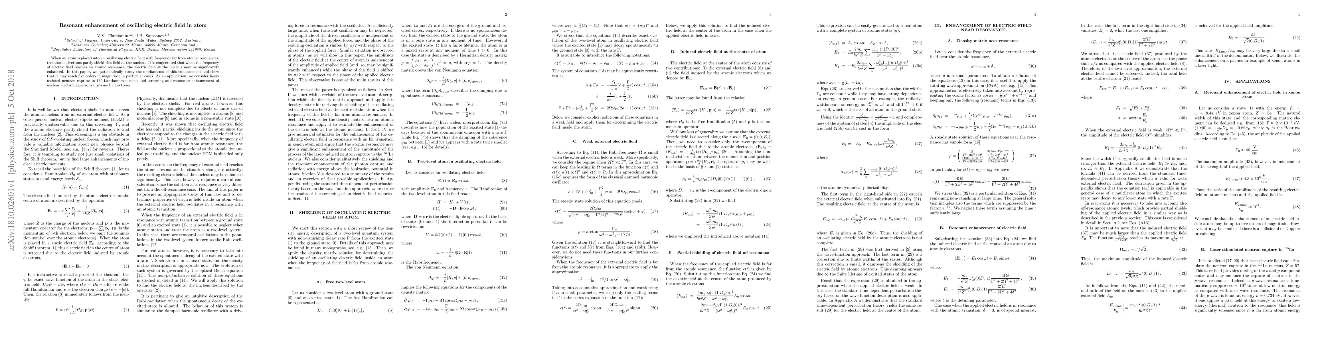 This paper explores the resonant enhancement of an oscillating electric field in atoms, demonstrating that when the field's frequency aligns with atomic resonances, the electric field at the nucleus can be significantly amplified by up to five orders of magnitude. The study also applies this effect to laser-assisted neutron capture and nuclear electromagnetic transitions.