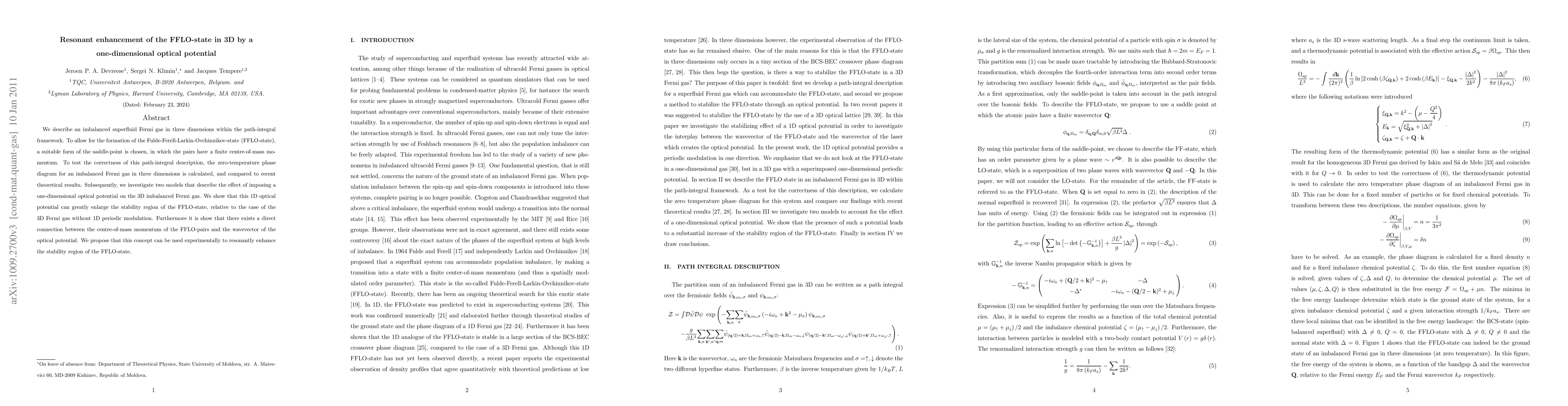 We describe an imbalanced superfluid Fermi gas in three dimensions within the path-integral framework. To allow for the formation of the Fulde-Ferell-Larkin-Ovchinnikov-state (FFLO-state), a suitable form of the saddle-point is chosen, in which the pairs have a finite centre-of-mass momentum. To test the correctness of this path-integral description, the zero-temperature phase diagram for an imbalanced Fermi gas in three dimensions is calculated, and compared to recent theoretical results. Subsequently, we investigate two models that describe the effect of imposing a one-dimensional optical potential on the 3D imbalanced Fermi gas. We show that this 1D optical potential can greatly enlarge the stability region of the FFLO-state, relative to the case of the 3D Fermi gas without 1D periodic modulation. Furthermore it is show that there exists a direct connection between the centre-of-mass momentum of the FFLO-pairs and the wavevector of the optical potential. We propose that this concept can be used experimentally to resonantly enhance the stability region of the FFLO-state.