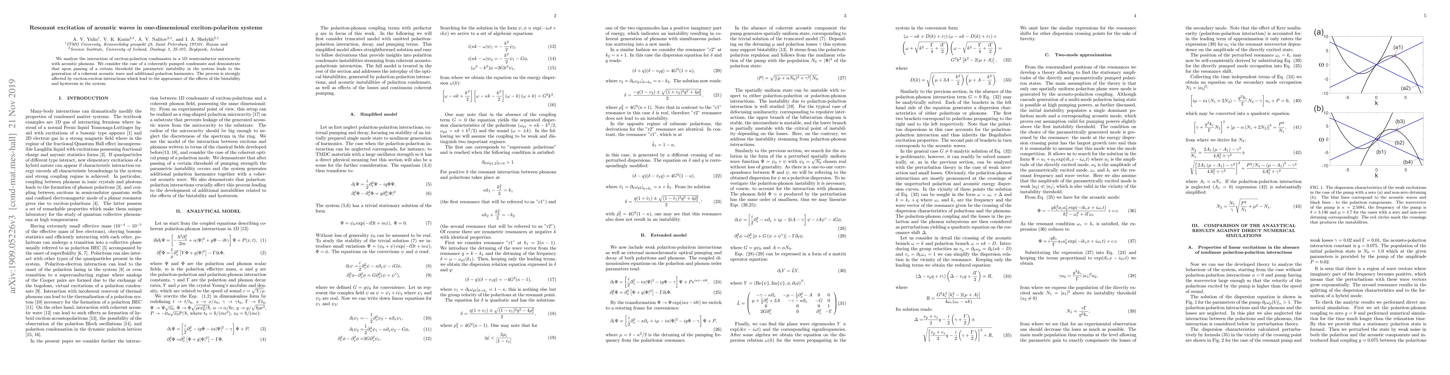 This paper investigates the resonant excitation of acoustic waves in exciton-polariton condensates within a one-dimensional semiconductor microcavity, revealing that a parametric instability generates coherent acoustic waves and polariton harmonics above a certain threshold, influenced by exciton-exciton interactions that induce bistability and hysteresis.