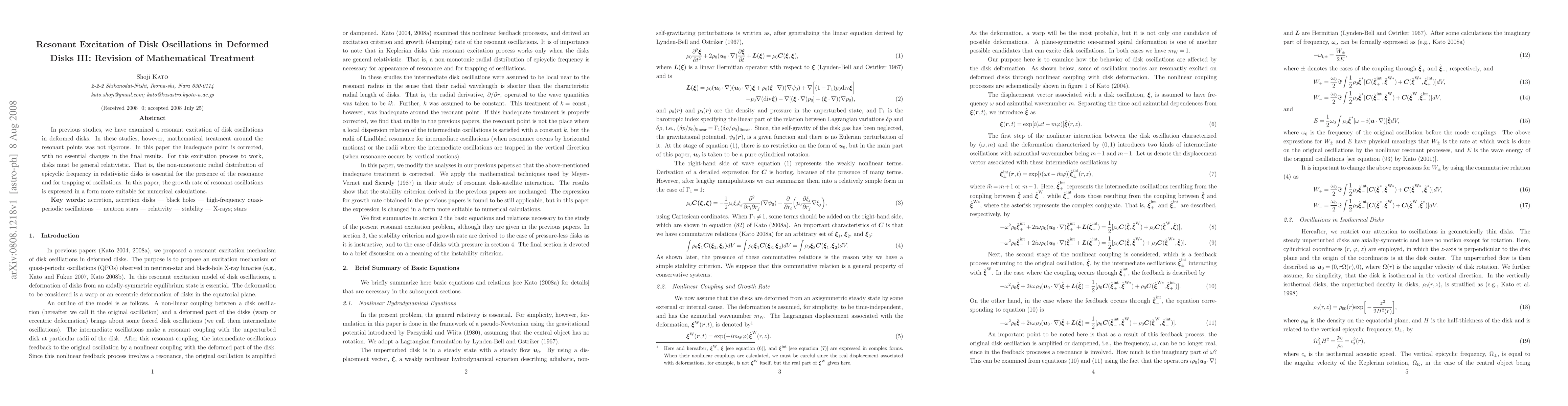 This paper revises the mathematical treatment of resonant excitation of disk oscillations in deformed, general relativistic disks, correcting previous inadequacies without altering the final results. It emphasizes the importance of the non-monotonic radial distribution of epicyclic frequency for resonance and oscillation trapping, and presents a more numerically suitable form for the growth rate of resonant oscillations.