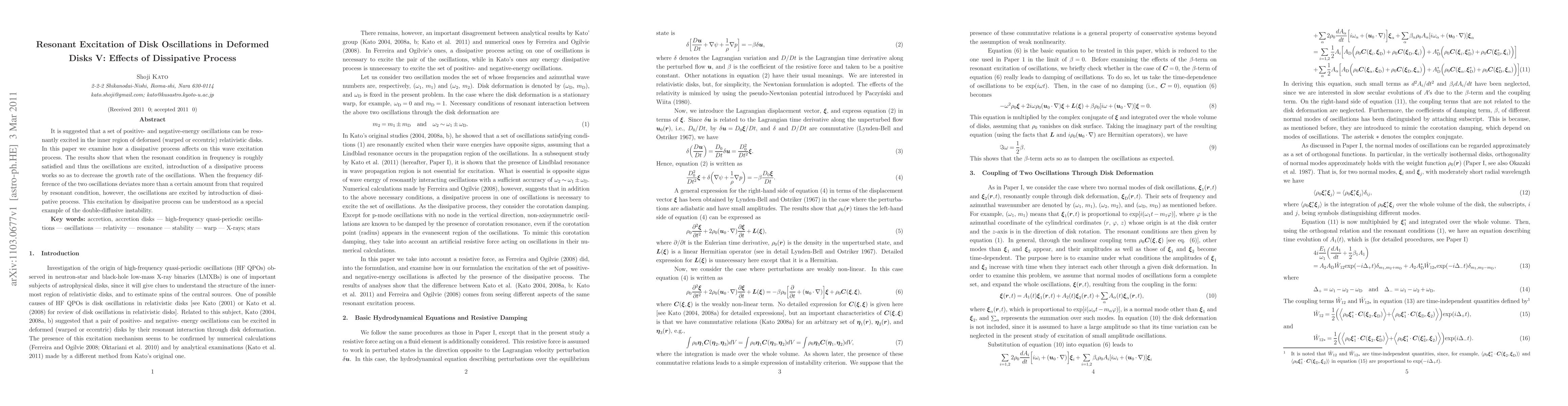 This paper investigates how dissipative processes influence the resonant excitation of oscillations in deformed relativistic disks, finding that while dissipation generally reduces oscillation growth when resonant conditions are met, it can also excite oscillations when the frequency difference deviates significantly from the resonant frequency, akin to a double-diffusive instability.