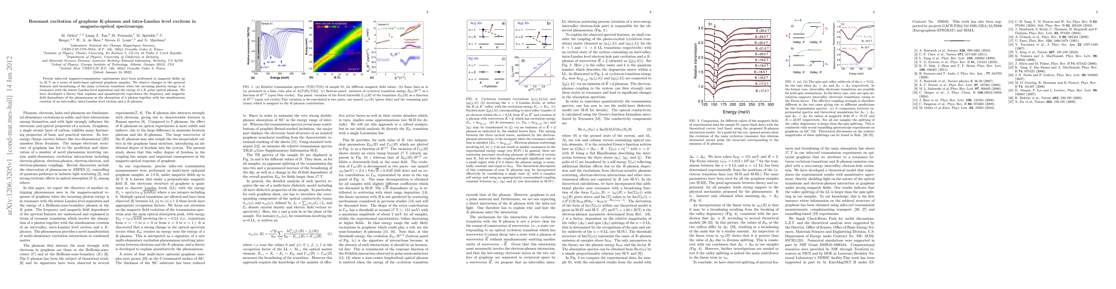 Precise infrared magnetotransmission experiments have been performed in magnetic fields up to 32 T on a series of multilayer epitaxial graphene samples. We observe changes in the spectral features and broadening of the main cyclotron transition when the incoming photon energy is in resonance with the lowest Landau level separation and the energy of a K point optical phonon. We have developed a theory that explains and quantitatively reproduces the frequency and magnetic field dependence of the phenomenon as the absorption of a photon together with the simultaneous creation of an intervalley, intra-Landau-level exciton, and a K phonon.
