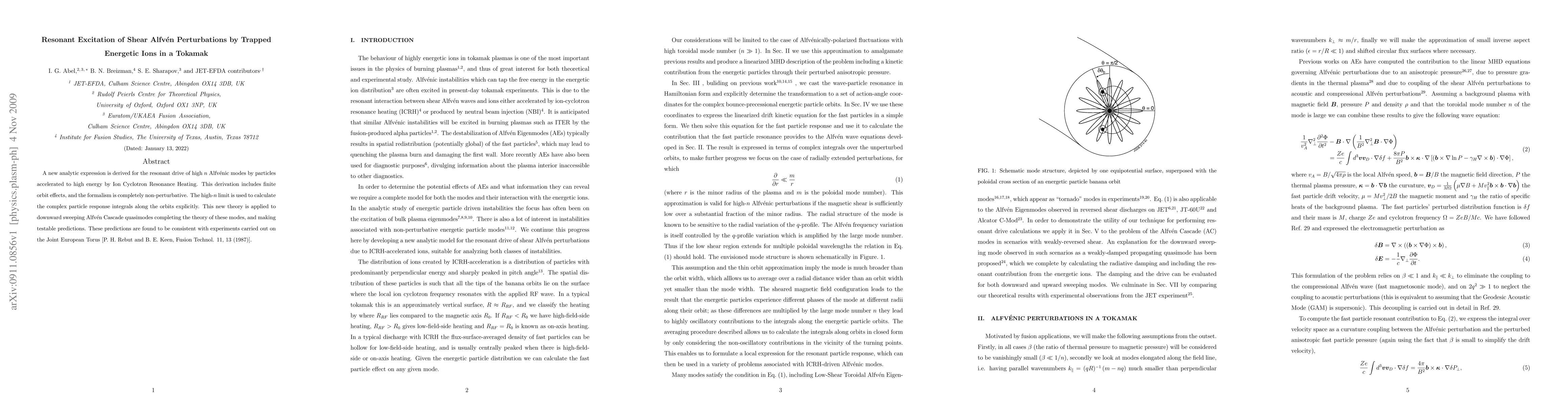 A new analytic expression is derived for the resonant drive of high n Alfvenic modes by particles accelerated to high energy by Ion Cyclotron Resonance Heating. This derivation includes finite orbit effects, and the formalism is completely non-perturbative. The high-n limit is used to calculate the complex particle response integrals along the orbits explicitly. This new theory is applied to downward sweeping Alfven Cascade quasimodes completing the theory of these modes, and making testable predictions. These predictions are found to be consistent with experiments carried out on the Joint European Torus [P. H. Rebut and B. E. Keen, Fusion Technol. 11, 13 (1987)].