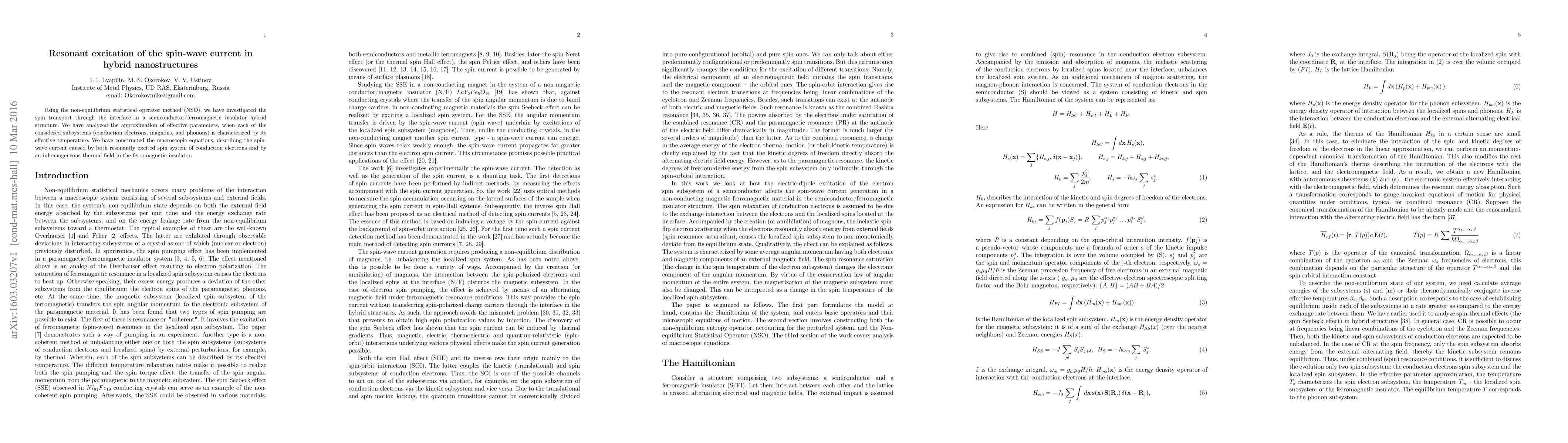 Using the non-equilibrium statistical operator method (NSO), we have investigated the spin transport through the interface in a semiconductor/ferromagnetic insulator hybrid structure. We have analyzed the approximation of effective parameters, when each of the considered subsystems (conduction electrons, magnons, and phonons) is characterized by its effective temperature. We have constructed the macroscopic equations, describing the spin-wave current caused by both resonantly excited spin system of conduction electrons and by an inhomogeneous thermal field in the ferromagnetic insulator.