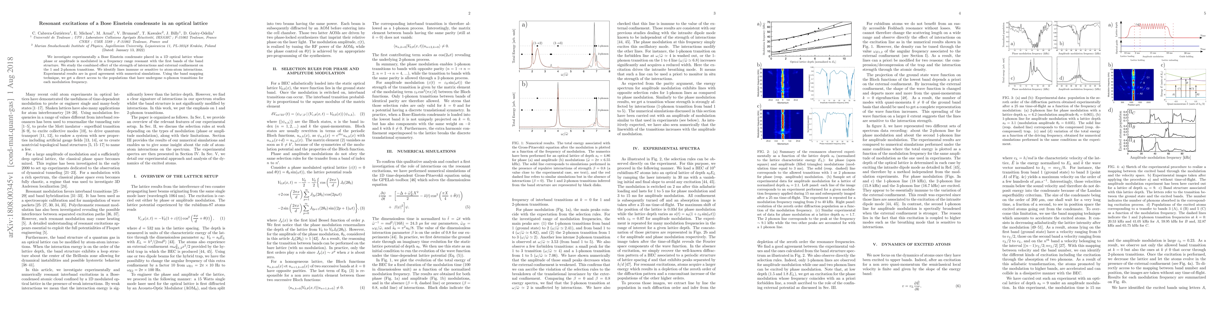 This research experimentally examines the resonant excitations of a Bose Einstein condensate in a 1D optical lattice, focusing on 1 and 2-phonon transitions influenced by interactions and confinement. Results align well with simulations, revealing distinct lines sensitive or immune to atom-atom interactions.