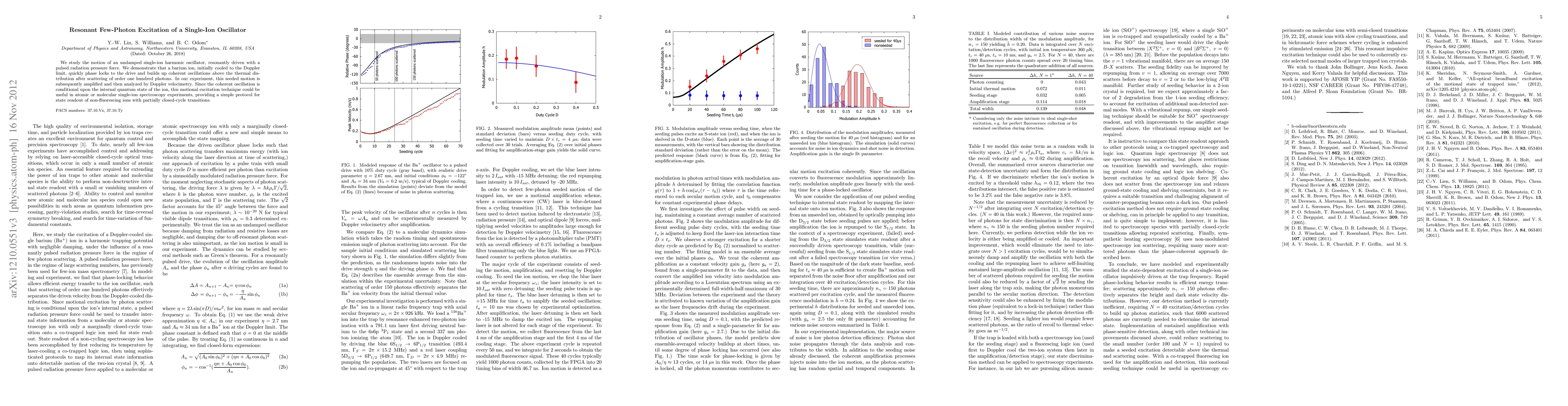 This paper investigates the resonant excitation of a single-ion oscillator using few-photon interactions, demonstrating phase locking and coherent oscillations above thermal noise in a barium ion. The technique, which relies on the ion's internal quantum state, offers a potential method for state readout in non-fluorescing ions in spectroscopy.