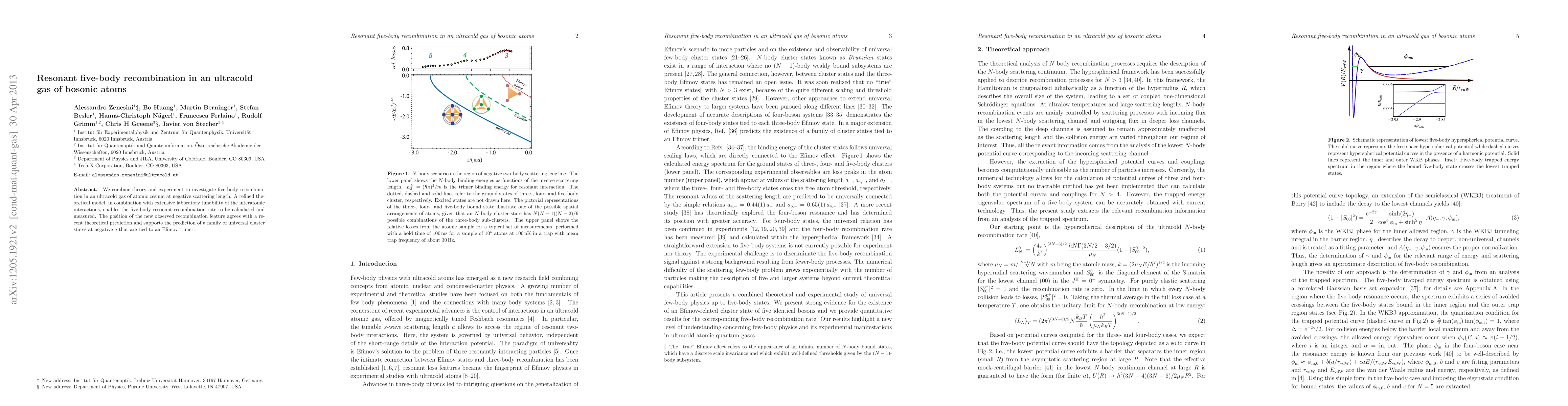 This paper combines theoretical and experimental methods to study five-body recombination in ultracold cesium atoms, revealing a new recombination feature that aligns with recent theoretical predictions of universal cluster states linked to Efimov trimers. The study supports the existence of these states at negative scattering lengths.