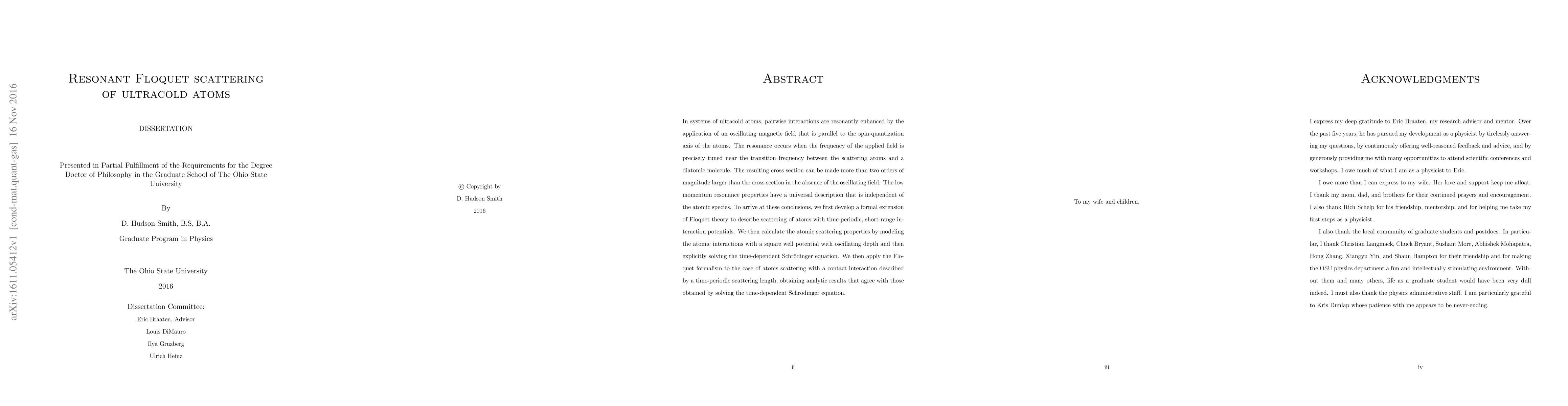 In systems of ultracold atoms, pairwise interactions are resonantly enhanced by the application of an oscillating magnetic field that is parallel to the spin-quantization axis of the atoms. The resonance occurs when the frequency of the applied field is precisely tuned near the transition frequency between the scattering atoms and a diatomic molecule. The resulting cross section can be made more than two orders of magnitude larger than the cross section in the absence of the oscillating field. The low momentum resonance properties have a universal description that is independent of the atomic species. To arrive at these conclusions, we first develop a formal extension of Floquet theory to describe scattering of atoms with time-periodic, short-range interaction potentials. We then calculate the atomic scattering properties by modeling the atomic interactions with a square well potential with oscillating depth and then explicitly solving the time-dependent Schrodinger equation. We then apply the Floquet formalism to the case of atoms scattering with a contact interaction described by a time-periodic scattering length, obtaining analytic results that agree with those obtained by solving the time-dependent Schrodinger equation.