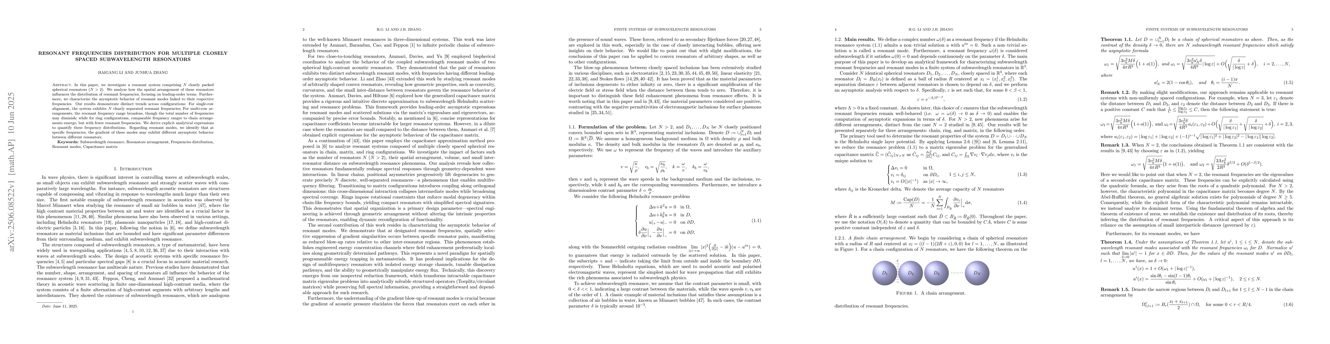 In this paper, we investigate a resonant system comprising $N$ closely packed spherical resonators ($N>2$). We analyze how the spatial arrangement of these resonators influences the distribution of resonant frequencies, focusing on leading-order terms. Furthermore, we characterize the asymptotic behavior of resonant modes linked to their respective frequencies. Our results demonstrate distinct trends across configurations: For single-row alignment, the system exhibits $N$ clearly separated resonant frequencies; For multi-row arrangements, the resonant frequency range broadens, though the total number of frequencies may diminish; while for ring configurations, comparable frequency ranges to chain arrangements emerge, but with fewer resonant frequencies. We derive explicit analytical expressions to quantify these frequency distributions. Regarding resonant modes, we identify that at specific frequencies, the gradient of these modes may exhibit different asymptotic behavior between different resonators.