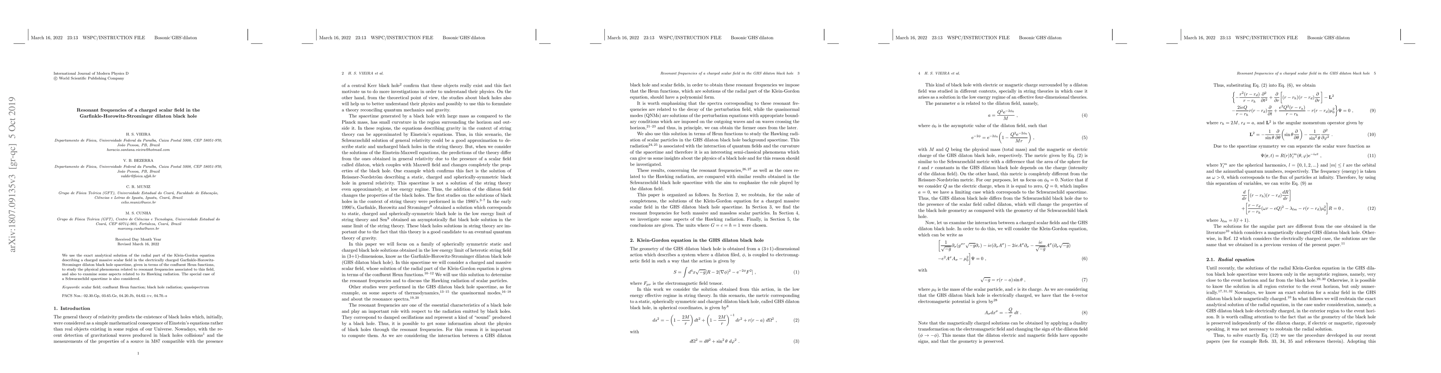 We use the exact analytical solution of the radial part of the Klein-Gordon equation describing a charged massive scalar field in the electrically charged Garfinkle-Horowitz-Strominger dilaton black hole spacetime, given in terms of the confluent Heun functions, to study the physical phenomena related to resonant frequencies associated to this field, and also to examine some aspects related to its Hawking radiation. The special case of a Schwarzschild spacetime is also considered.