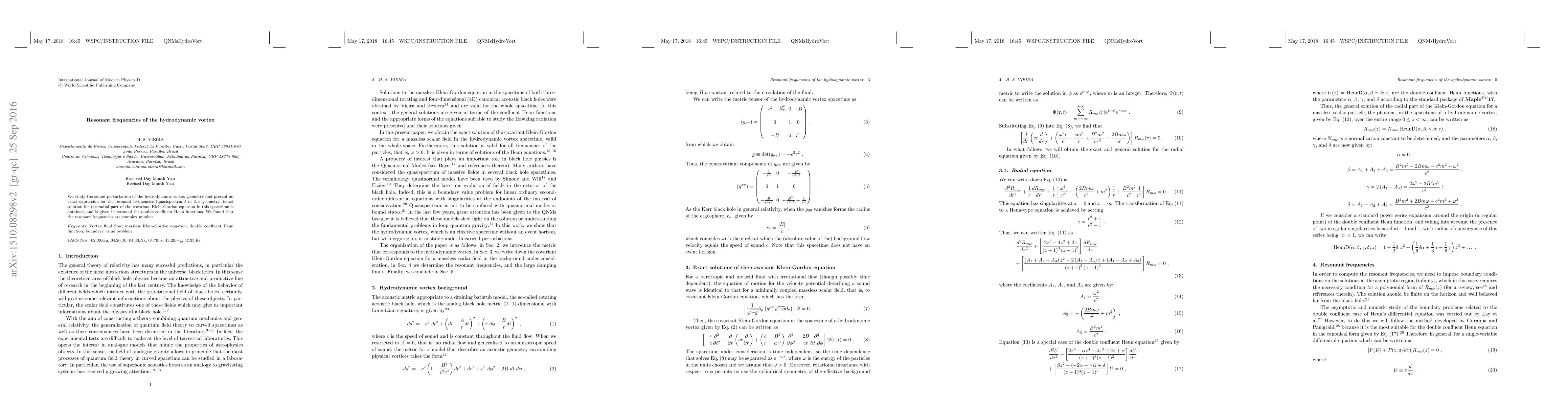 This paper investigates the sound perturbation in hydrodynamic vortex geometry, deriving an exact expression for its resonant frequencies using double confluent Heun functions. The study reveals that the resonant frequencies are complex numbers.