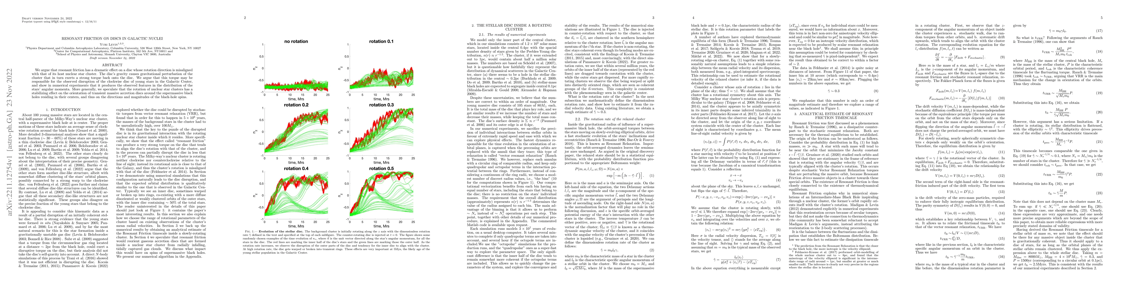 We argue that resonant friction has a dramatic effect on a disc whose rotation direction is misaligned with that of its host nuclear star cluster. The disc's gravity causes gravitational perturbation of the cluster that in turn exerts a strong torque back onto the disc. We argue that this torque may be responsible for the observed disruption of the clockwise disc of young stars in the Galactic Center, and show in numerical experiments that it produces the observed features in the distribution of the stars' angular momenta. More generally, we speculate that the rotation of nuclear star clusters has a stabilizing effect on the orientation of transient massive accretion discs around the supermassive black holes residing in their centers, and thus on the directions and magnitudes of the black-hole spins.