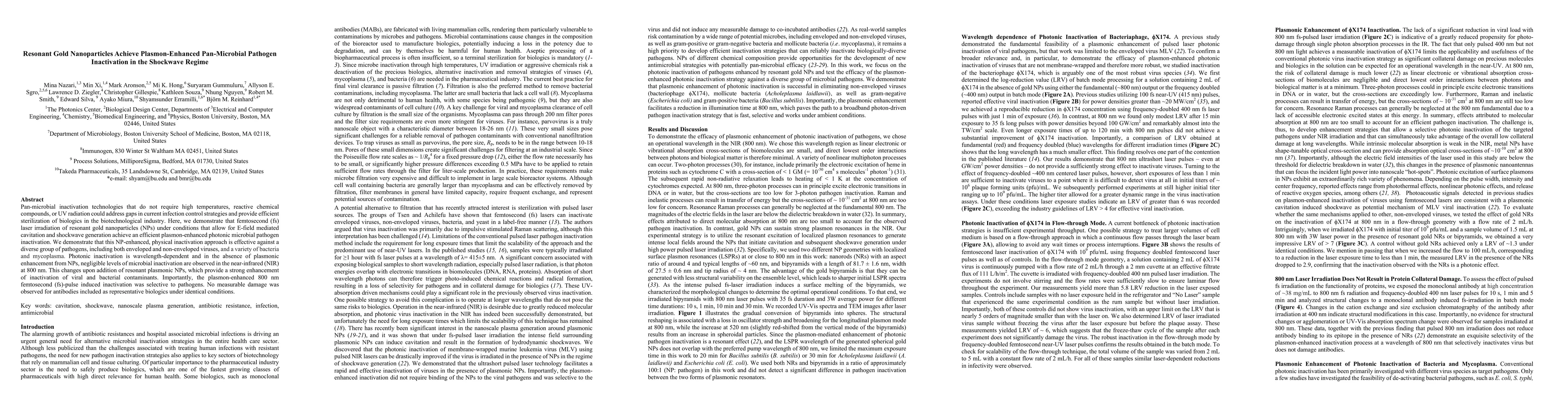 This paper demonstrates that femtosecond laser-induced shockwaves from resonant gold nanoparticles achieve efficient, pan-microbial pathogen inactivation without high temperatures or chemicals. The plasmonic enhancement significantly increases microbial inactivation at 800 nm, selectively targeting pathogens while preserving biologics.