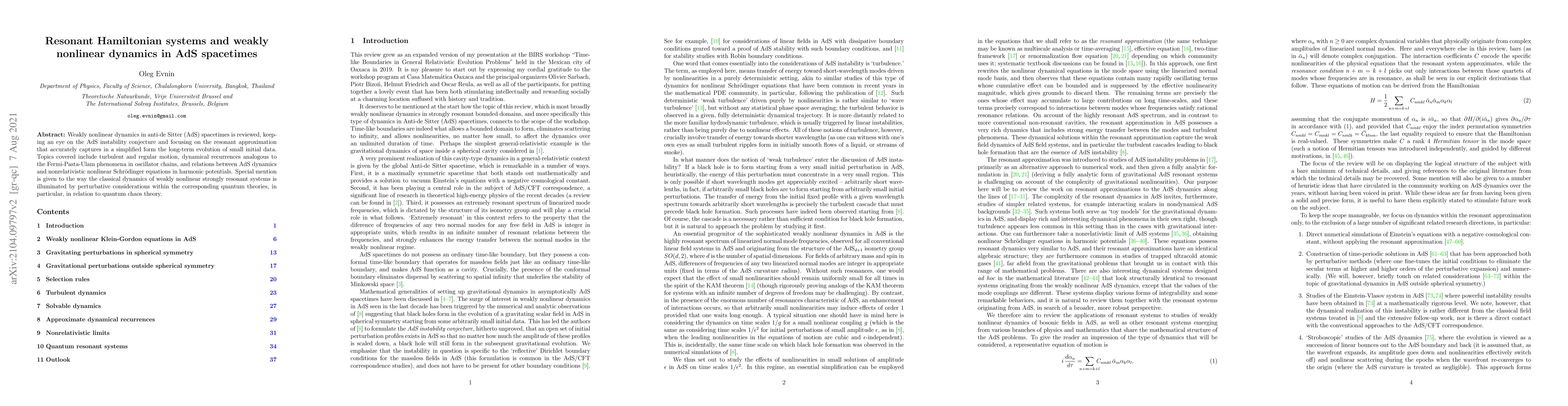 Weakly nonlinear dynamics in anti-de Sitter (AdS) spacetimes is reviewed, keeping an eye on the AdS instability conjecture and focusing on the resonant approximation that accurately captures in a simplified form the long-term evolution of small initial data. Topics covered include turbulent and regular motion, dynamical recurrences analogous to the Fermi-Pasta-Ulam phenomena in oscillator chains, and relations between AdS dynamics and nonrelativistic nonlinear Schrodinger equations in harmonic potentials. Special mention is given to the way the classical dynamics of weakly nonlinear strongly resonant systems is illuminated by perturbative considerations within the corresponding quantum theories, in particular, in relation to quantum chaos theory.