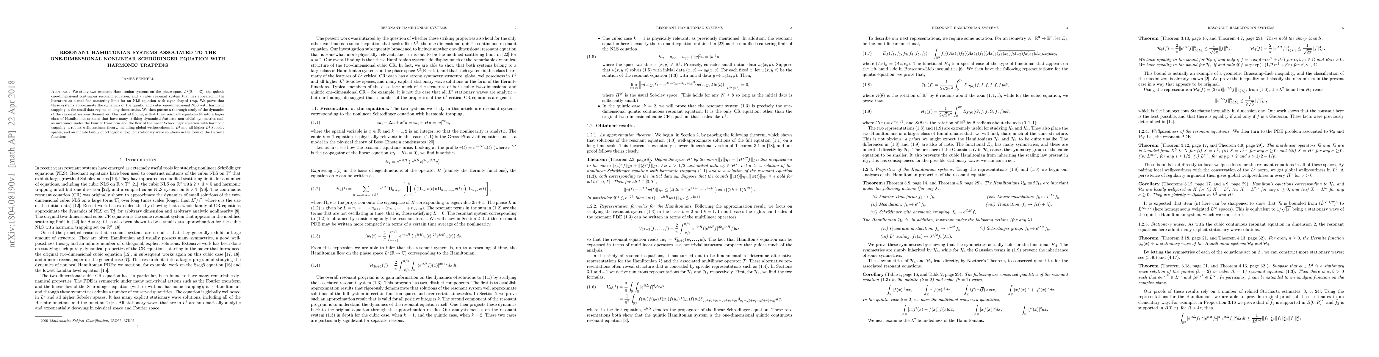 Researchers develop two resonant Hamiltonian systems that approximate dynamics of a one-dimensional nonlinear Schr"odinger equation with harmonic trapping in the small data regime.