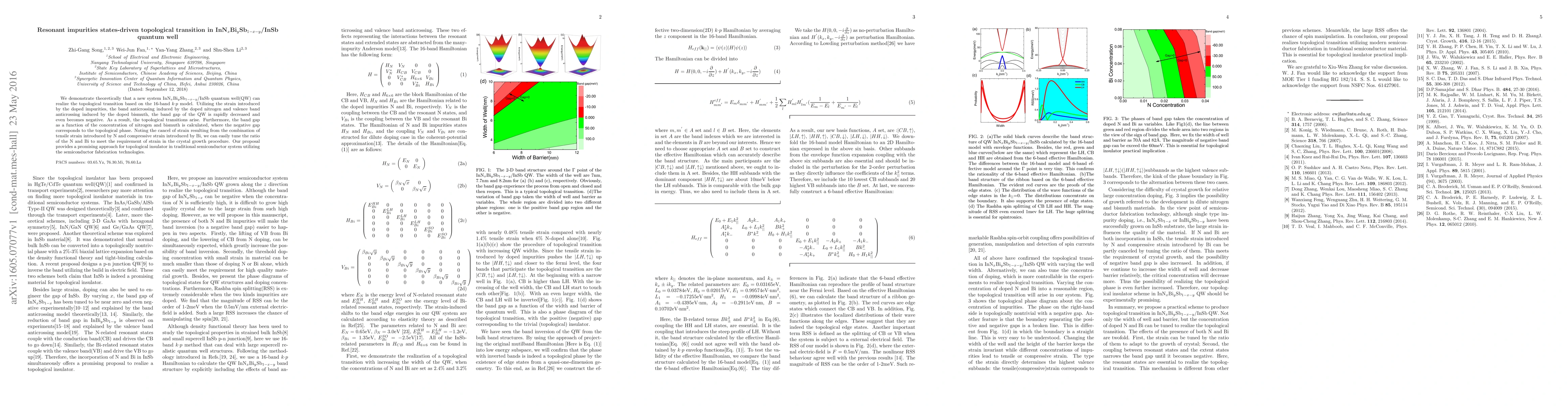 We demonstrate theoretically that a new system quantum well can realize the topological transition based on the 16-band kp model. Utilizing the strain introduced by the doped impurities, the band anti crossing induced by the doped nitrogen and valence band anti crossing induced by the doped bismuth, the band gap of the quantum well is rapidly decreased and even becomes negative. As a result, the topological transitions arise. Furthermore, the band gap as a function of the concentration of nitrogen and bismuth is calculated, where the negative gap corresponds to the topological phase. Noting the cancel of strain resulting from the combination of tensile strain introduced by N and strain introduced by Bi, we can easily tune the ratio of the N and Bi to meet the requirement of strain in the crystal growth procedure. Our proposal provides a promising approach for topological insulator in traditional semiconductor system utilizing the semiconductor fabrication technologies.