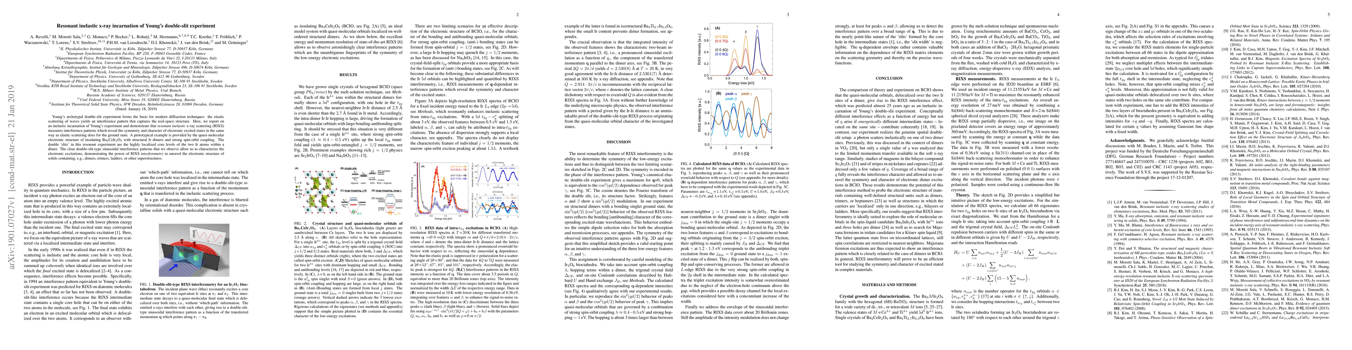 This paper demonstrates the use of resonant inelastic x-ray scattering (RIXS) to perform an inelastic version of Young's double-slit experiment, revealing interference patterns that characterize the symmetry and nature of electronic excited states, exemplified by the quasi-molecular structure of Ba3CeIr2O9. The study highlights the potential of RIXS interferometry for probing the electronic structure of complex materials.