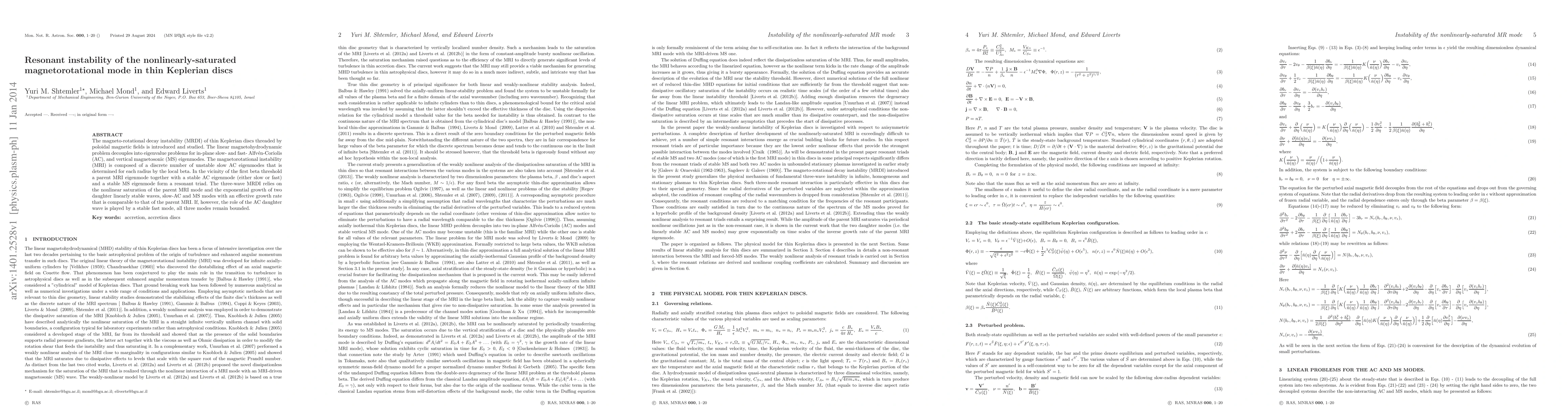 This paper investigates the magneto-rotational decay instability (MRDI) in thin Keplerian discs, focusing on the nonlinear saturation of the magnetorotational instability (MRI). The MRDI involves a resonant triad of modes, where the exponential growth of stable Alfv'en-Coriolis and magnetosonic modes is driven by the nonlinear saturation of the parent MRI mode.