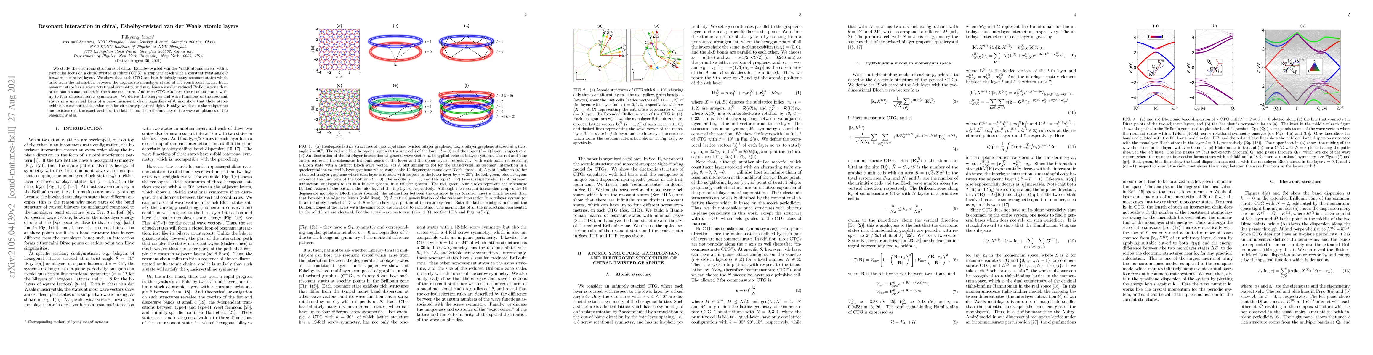 We study the electronic structures of chiral, Eshelby-twisted van der Waals atomic layers with a particular focus on a chiral twisted graphite (CTG), a graphene stack with a constant twist angle $\theta$ between successive layers. We show that each CTG can host infinitely many resonant states which arise from the interaction between the degenerate monolayer states of the constituent layers. Each resonant state has a screw rotational symmetry, and may have a smaller reduced Brillouin zone than other non-resonant states in the same structure. And each CTG can have the resonant states with up to four different screw symmetries. We derive the energies and wave functions of the resonant states in a universal form of a one-dimensional chain regardless of $\theta$, and show that these states exhibit a clear optical selection rule for circularly polarized light. Finally, we discuss the uniqueness and existence of the exact center of the lattice and the self-similarity of the wave amplitudes of the resonant states.