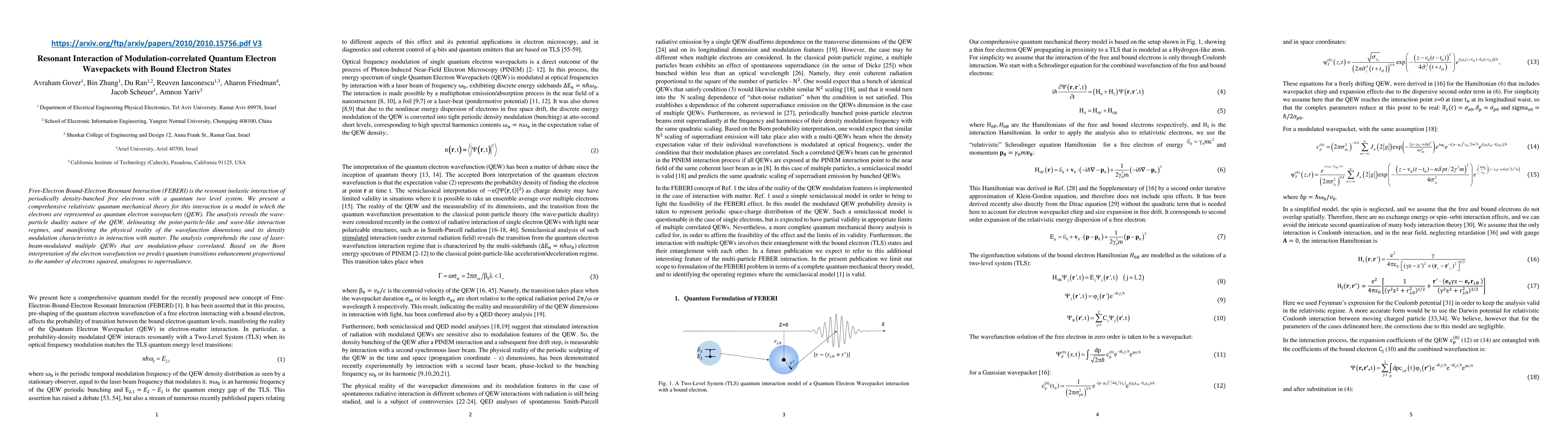 Free-Electron Bound-Electron Resonant Interaction (FEBERI) is the resonant inelastic interaction of periodically density-bunched free electrons with a quantum two level system. We present a comprehensive relativistic quantum mechanical theory for this interaction in a model in which the electrons are represented as quantum electron wavepackets (QEW). The analysis reveals the wave-particle duality nature of the QEW, delineating the point-particle-like and wave-like interaction regimes, and manifesting the physical reality of the wavefunction dimensions and its density modulation characteristics in interaction with matter. The analysis comprehends the case of laser-beam-modulated multiple QEWs that are modulation-phase correlated. Based on the Born interpretation of the electron wavefunction we predict quantum transitions enhancement proportional to the number of electrons squared, analogous to superradiance.
