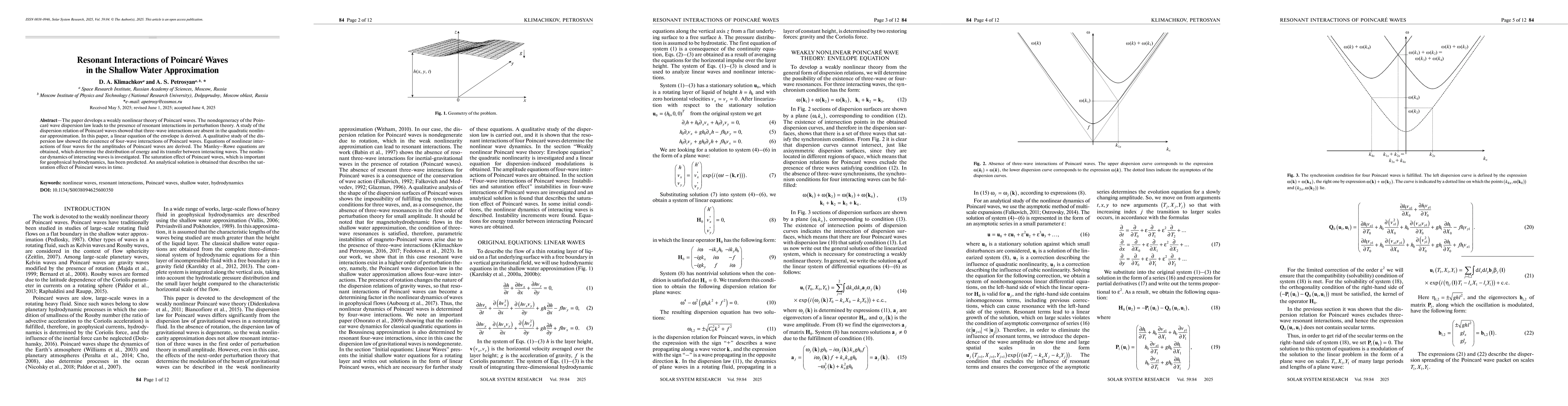 The paper develops a weakly nonlinear theory of Poincare waves. The nondegeneracy of the Poincare wave dispersion law leads to the presence of resonant interactions in perturbation theory. A study of the dispersion relation of Poincare waves showed that three-wave interactions are absent in the quadratic nonlinear approximation. In this paper, a linear equation of the envelope is derived. A qualitative study of the dispersion law showed the existence of four-wave interactions of Poincare waves. Equations of nonlinear interactions of four waves for the amplitudes of Poincare waves are derived. The Manley-Rowe equations are obtained, which determine the distribution of energy and its transfer between interacting waves. The nonlinear dynamics of interacting waves is investigated. The saturation effect of Poincare waves, which is important for geophysical hydrodynamics, has been predicted. An analytical solution is obtained that describes the saturation effect of Poincare waves in time.